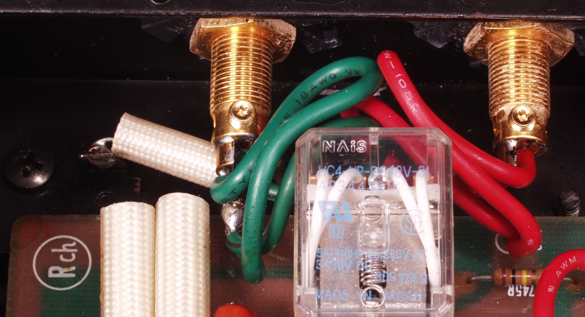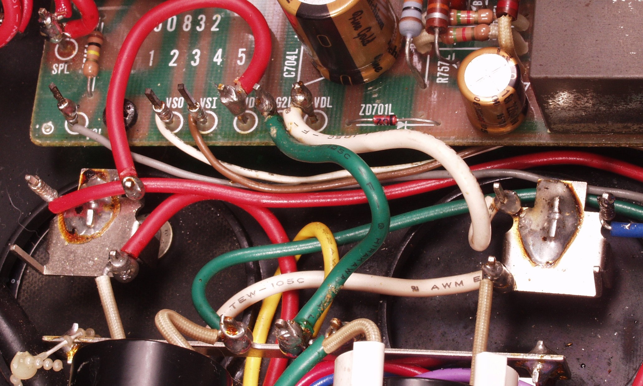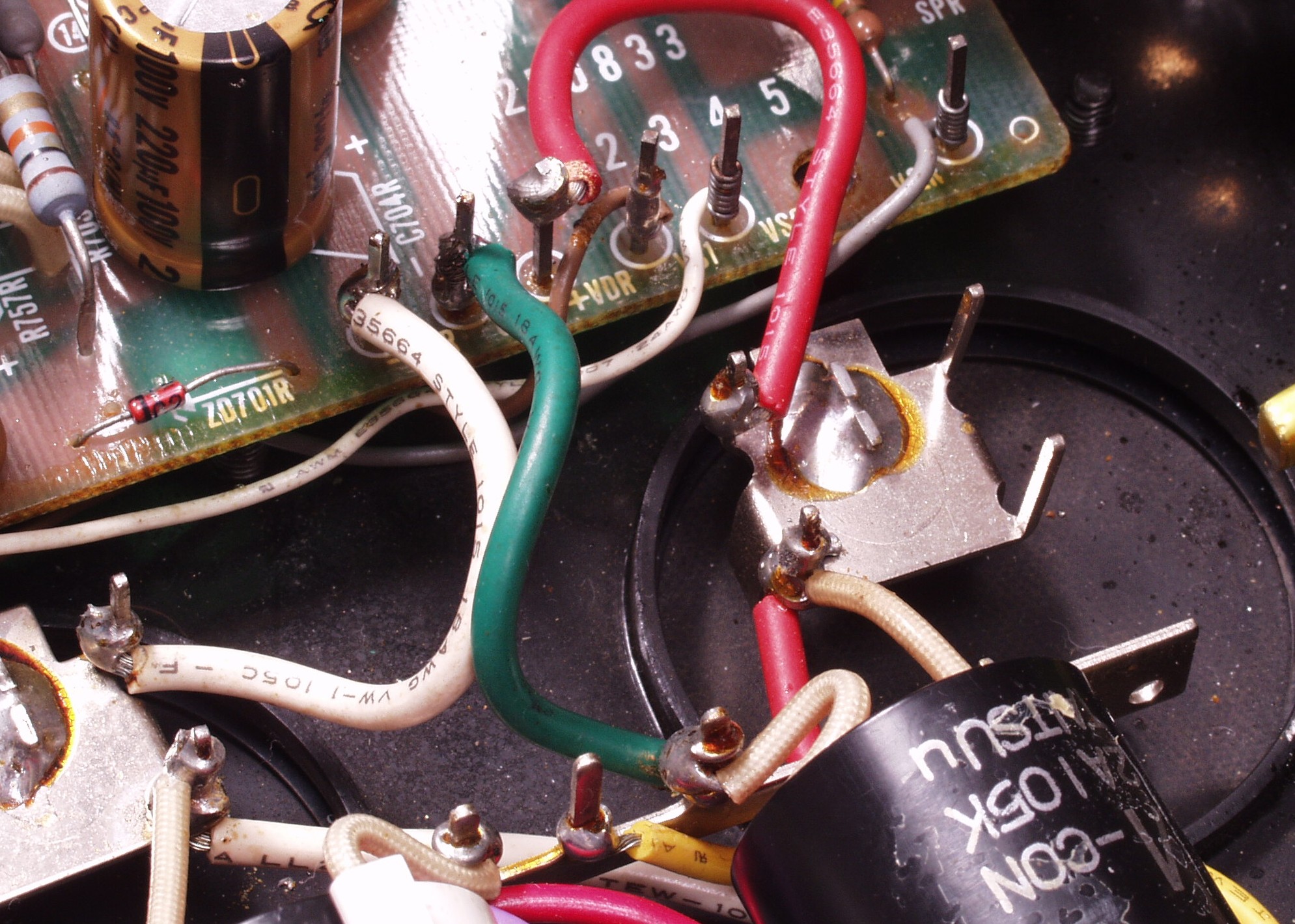 | C5E. 修理(半田補正)後 RCA端子基板裏 半田を全部やり直す フイルムコンデンサー2個交換、2個増設 |