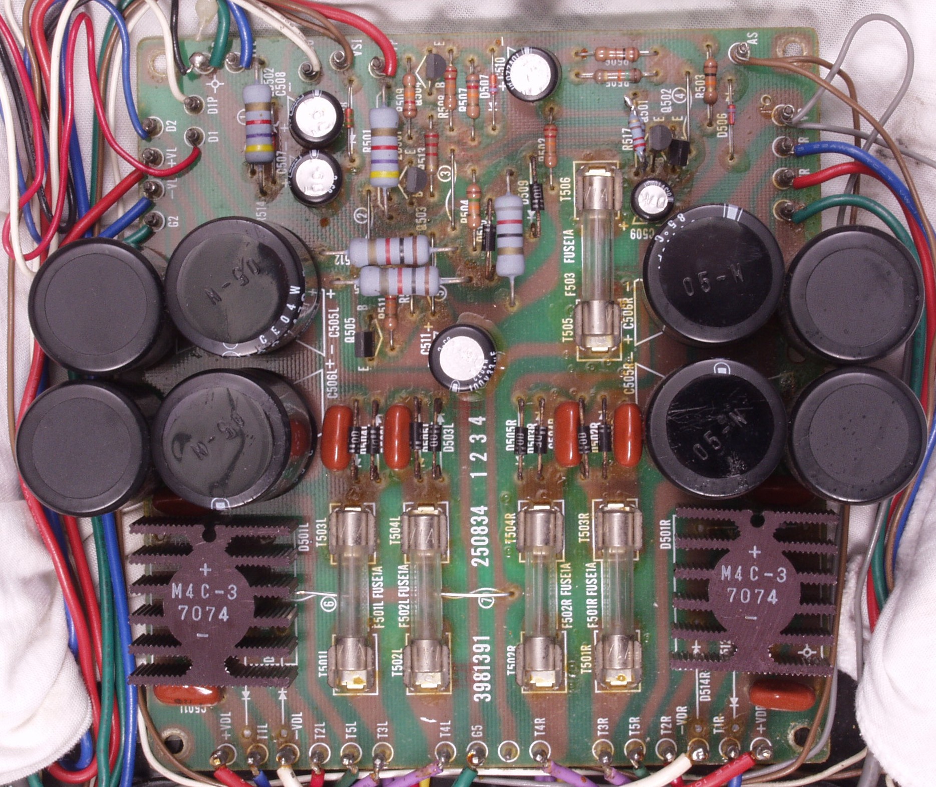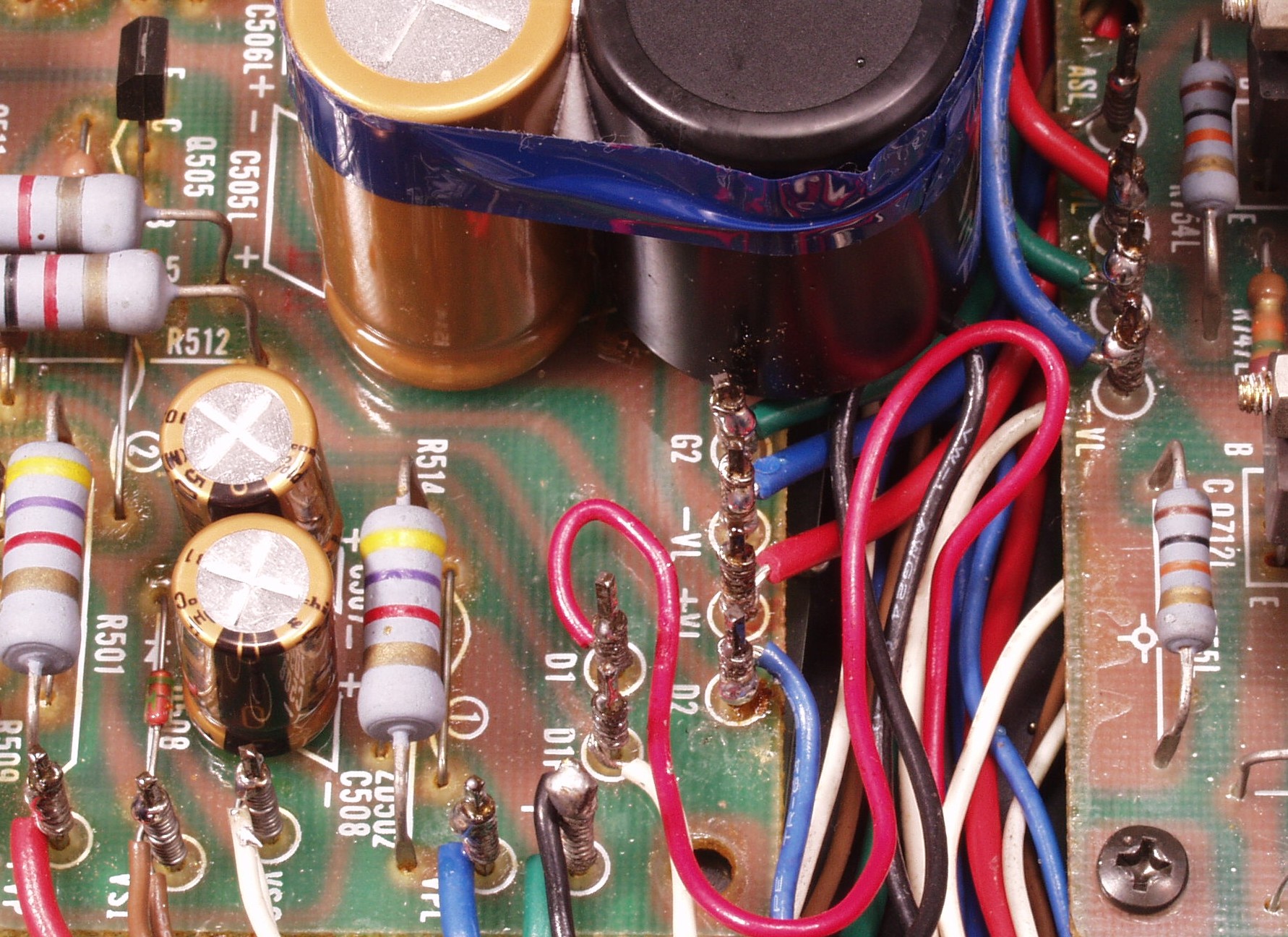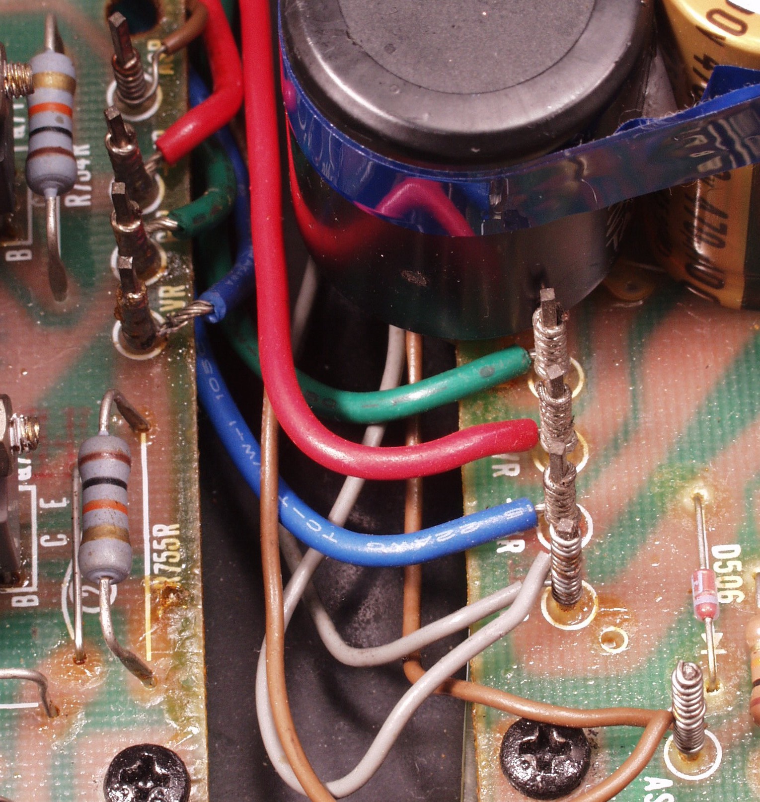 | C8G. 修理前 R−AMP基盤−電源基板へのラッピング線 |