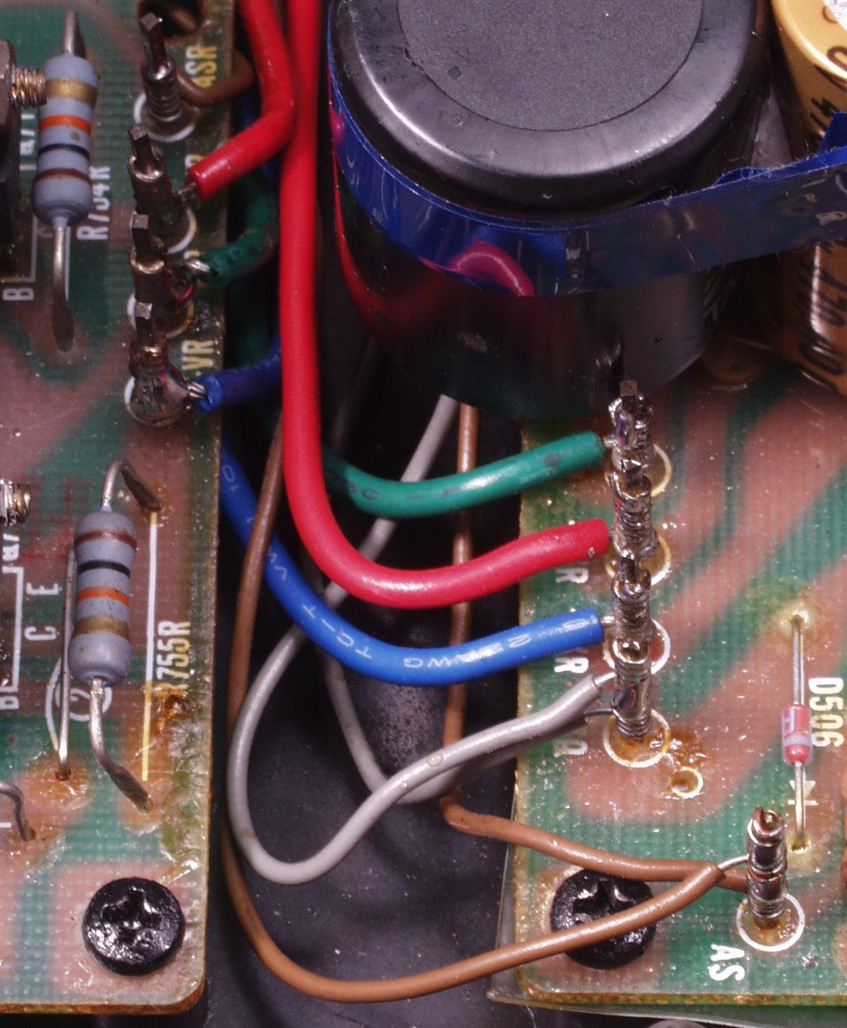 | C8E. 修理前 R−AMP基盤−電源基板へのラッピング線 |