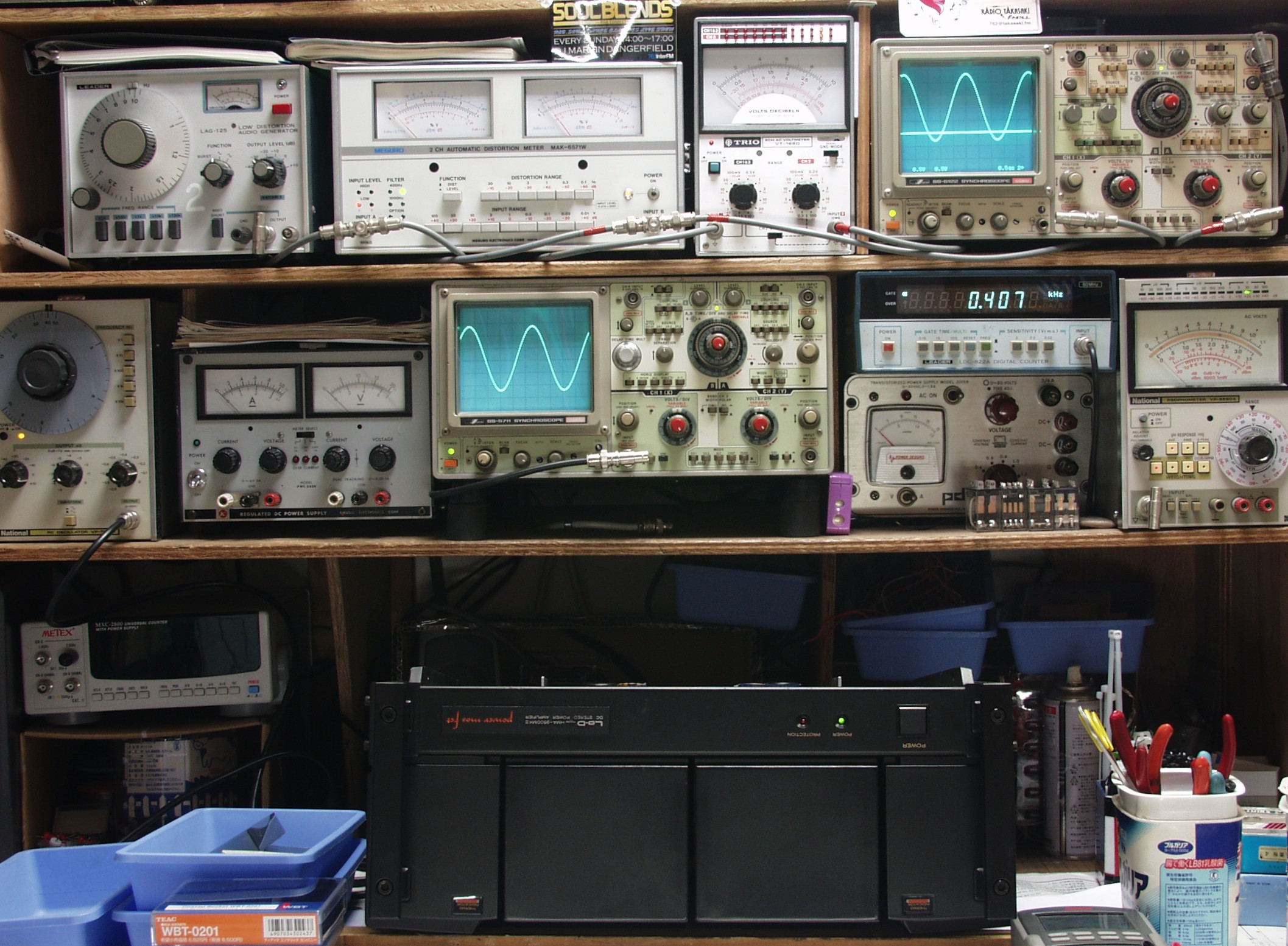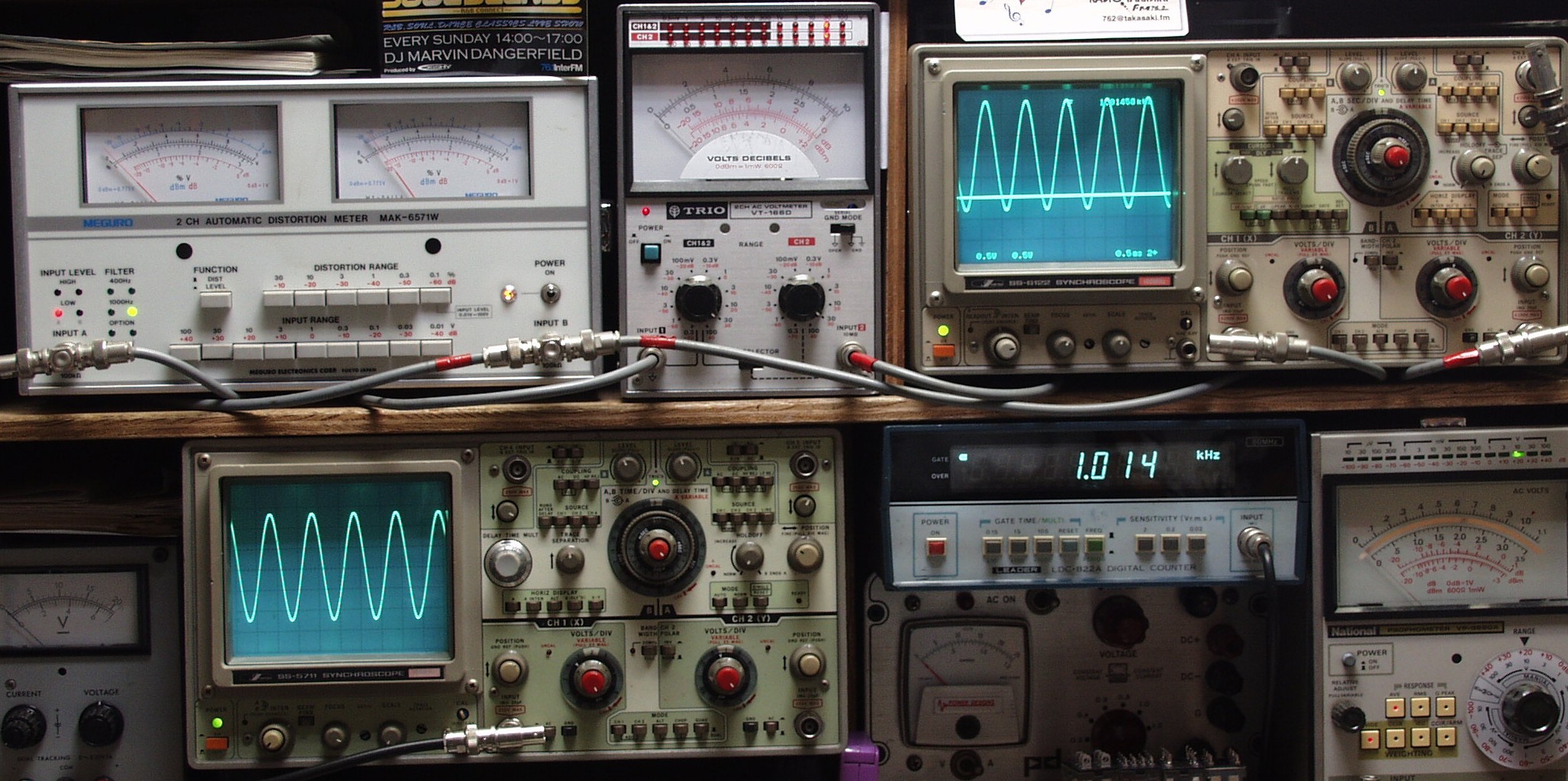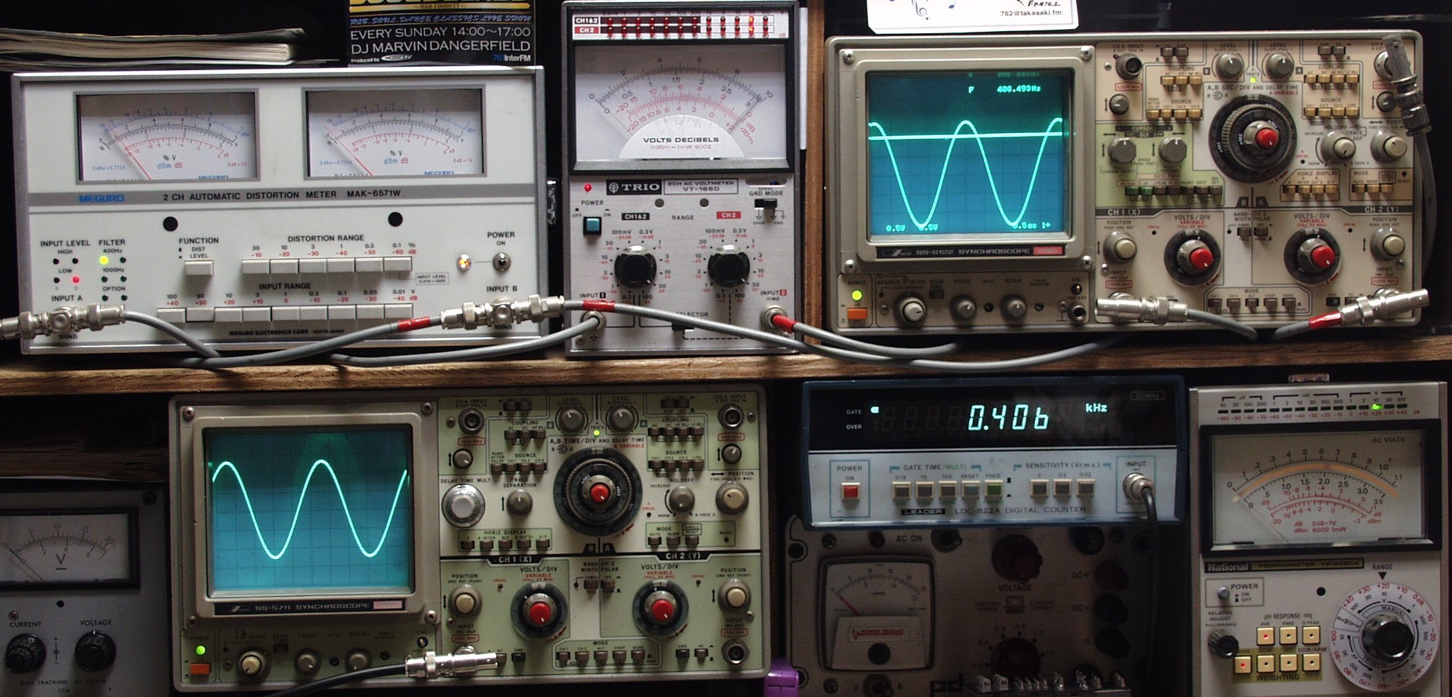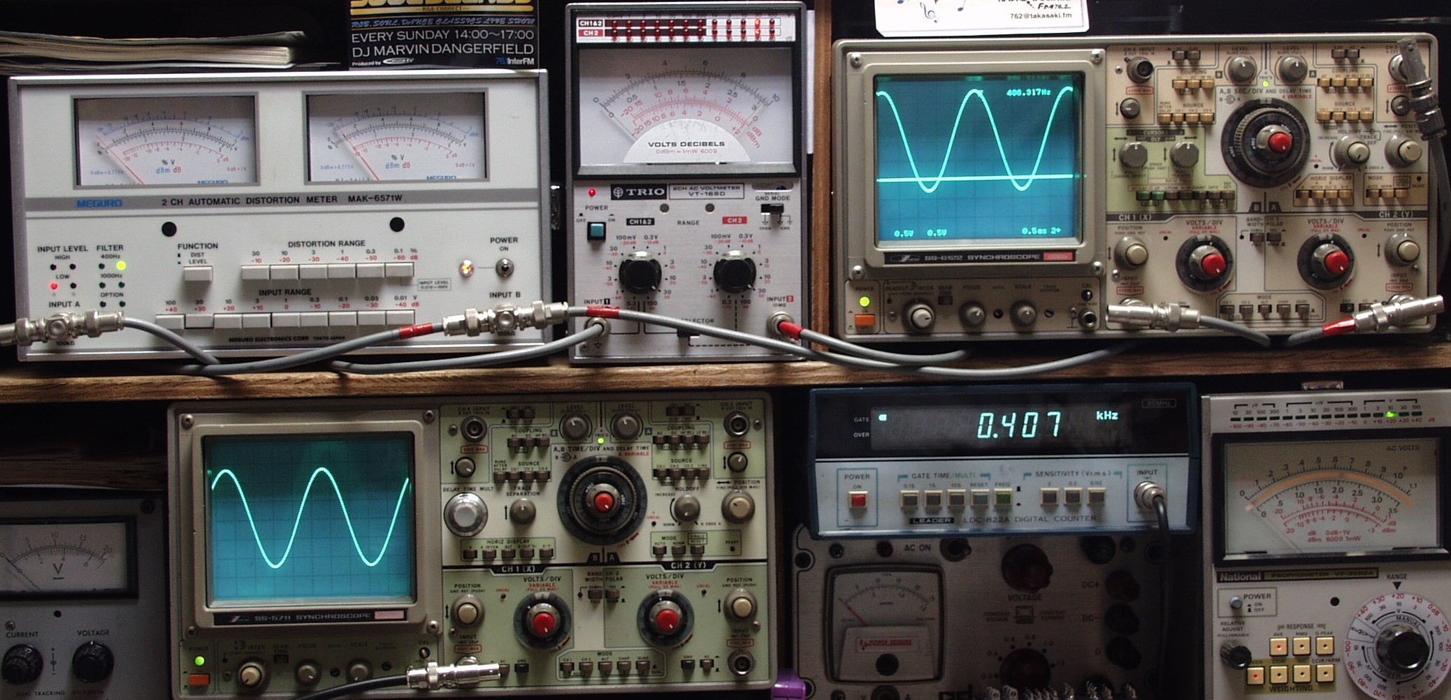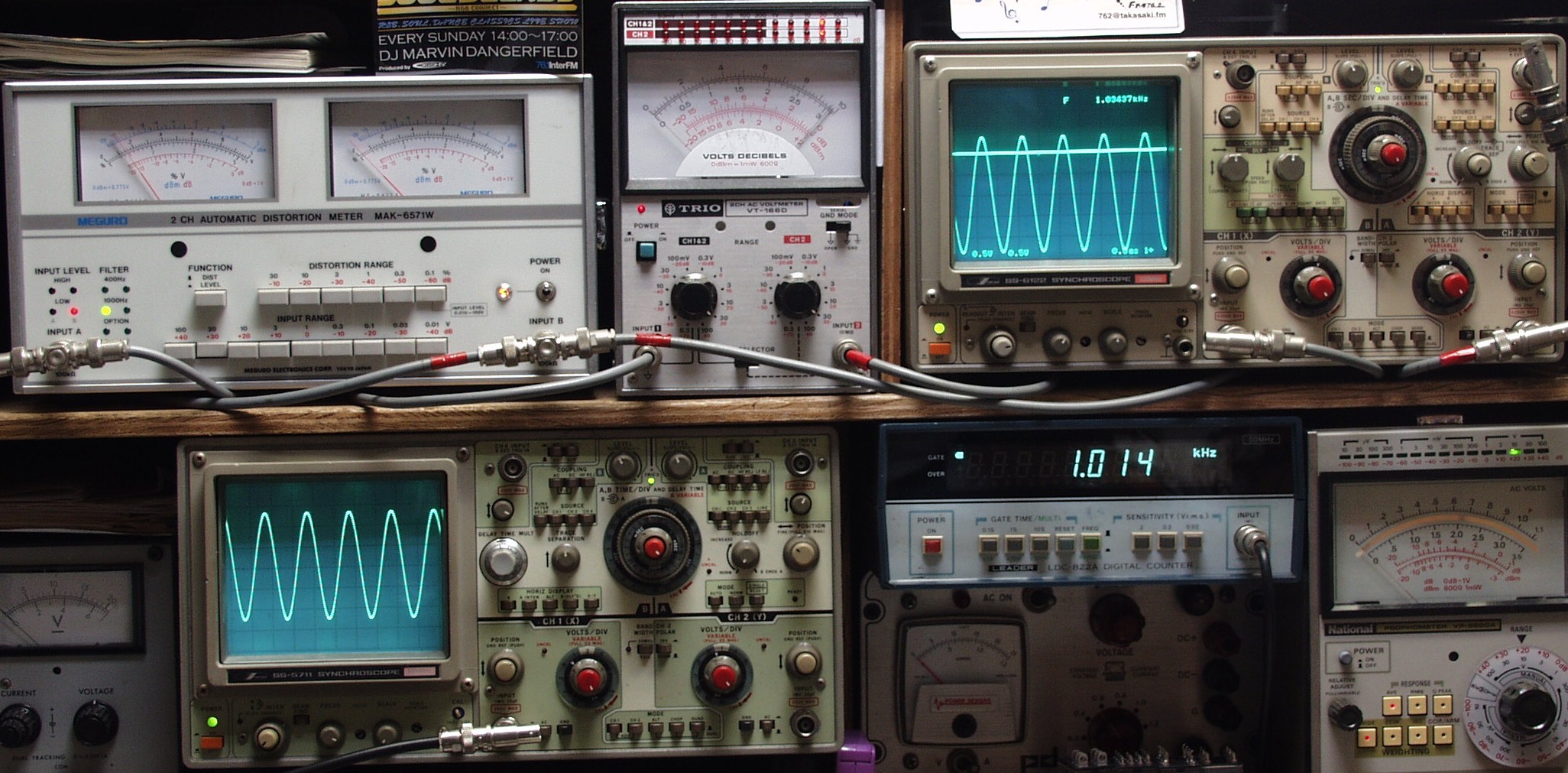 | E. 調整・測定 E1. 出力/歪み率測定・調整 <見方> 下左オーディオ発振器より400HZ・1KHZの信号を出す(歪み率=約0.003%) 下中=入力波形(オーディオ発振器のTTLレベル) 下右=周波数計 上左=SP出力の歪み率測定 左メータ=L出力、右メータ=R出力 上中=SP出力電圧測定器、赤針=R出力、黒針=L出力 上右=SP出力波形オシロ 上=R出力、下=L出力(出力電圧測定器の出力) |