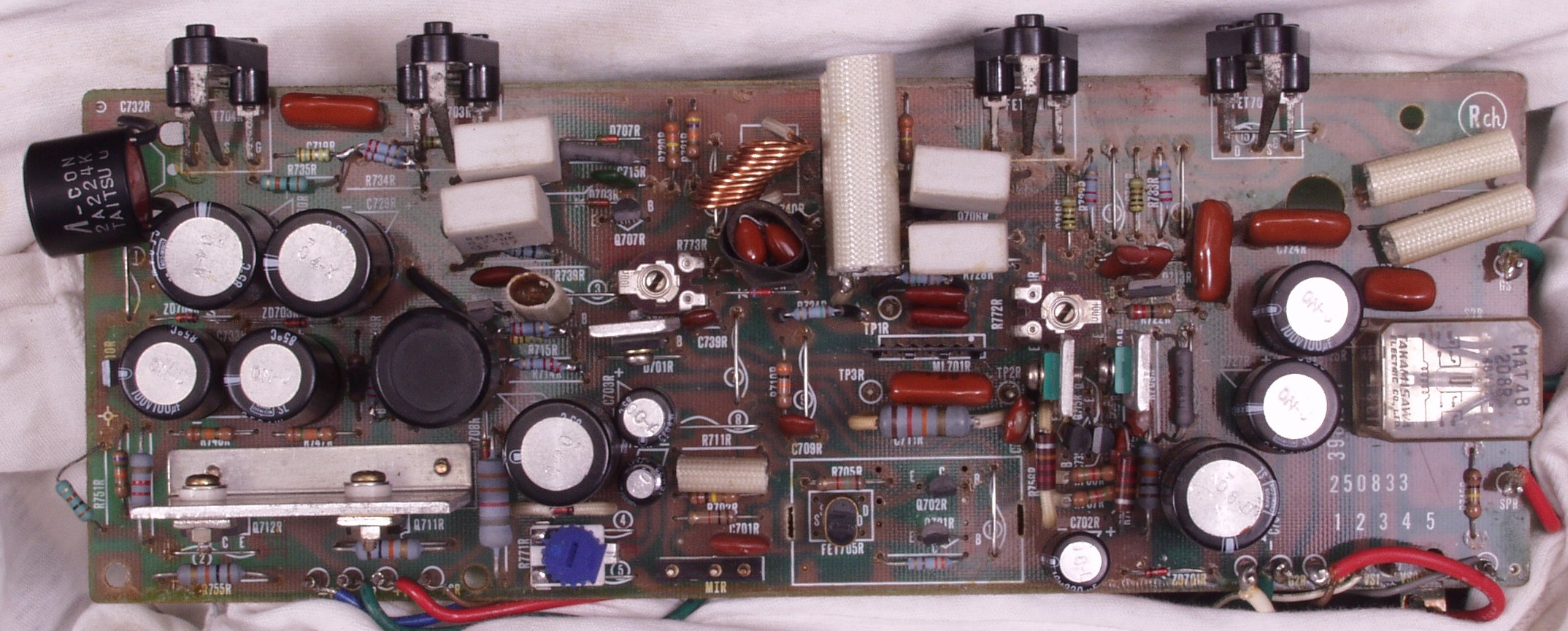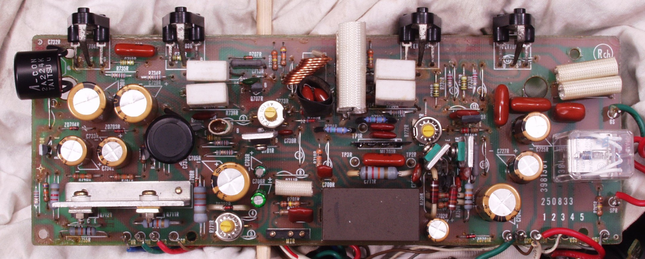 | C1B. 修理後 Rドライブ基板 初段FET、バランス・バイアス調整用半固定VR3個、SP接続リレー交換 フューズ入り抵抗全部、電解コンデンサー11個交換 |