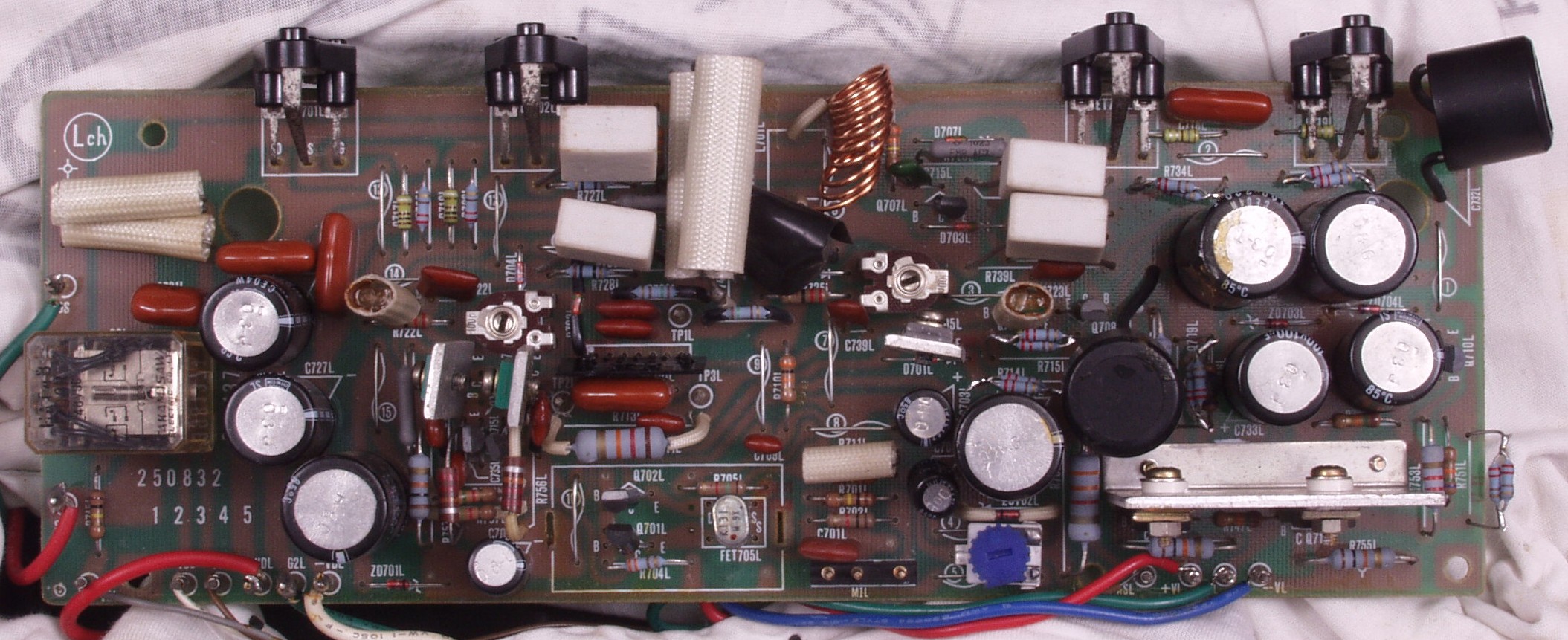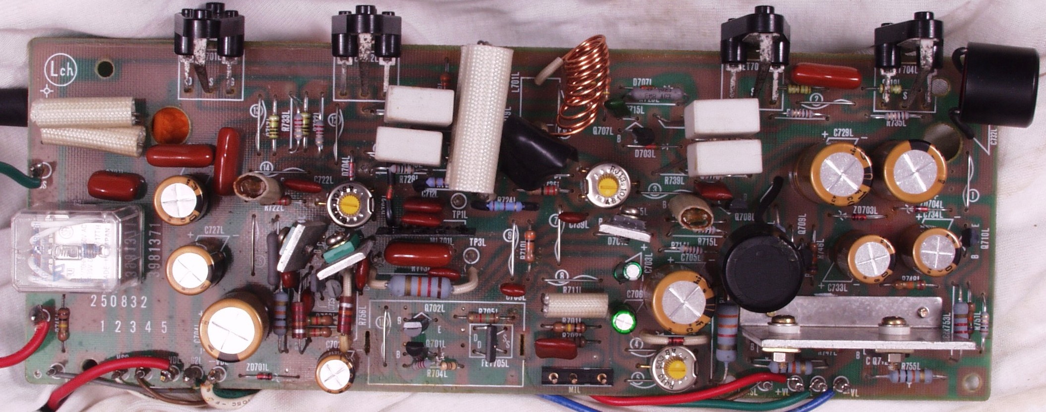 | C2B. 修理後 Lドライブ基板 初段FET、バランス/バイアス調整用半固定VR3個、SP接続リレー交換 フューズ入り抵抗全部、電解コンデンサー11個交換 |
