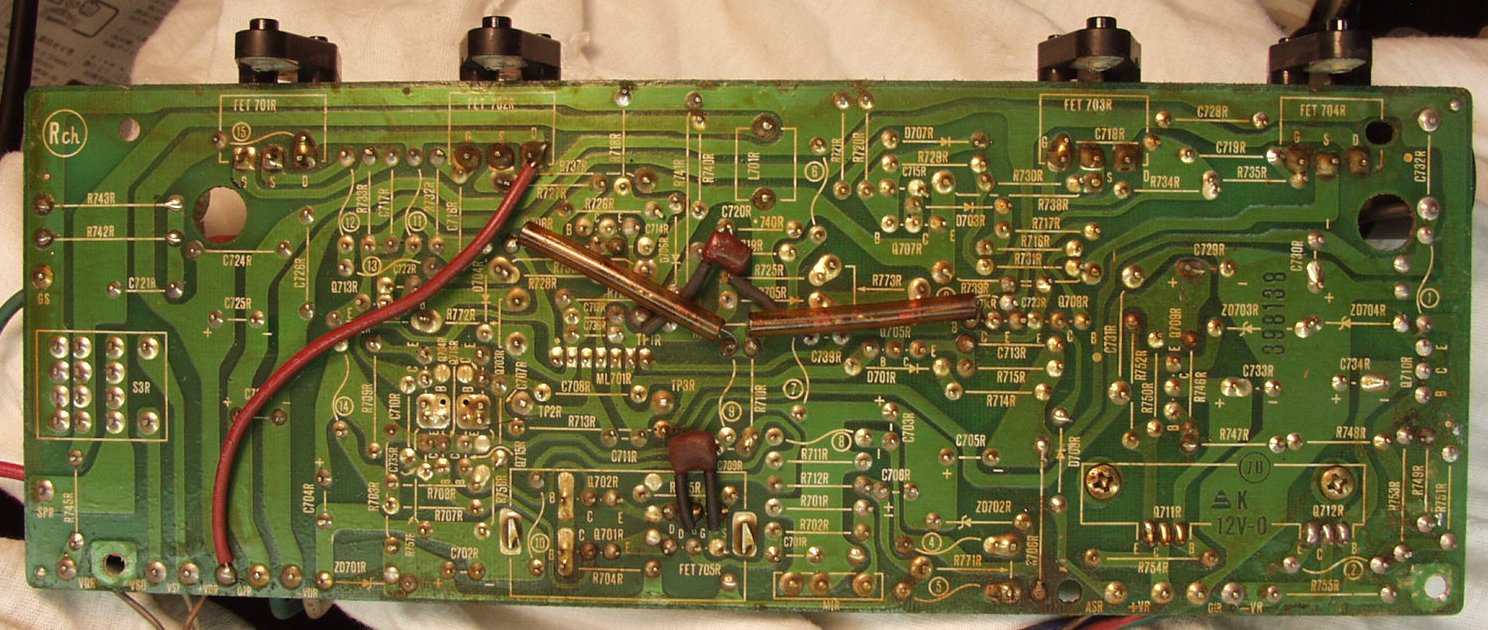 C−1B. 修理後 Rドライブ基板 初段FET、バランス/バイアス調整用半固定VR、SP接続リレー交換