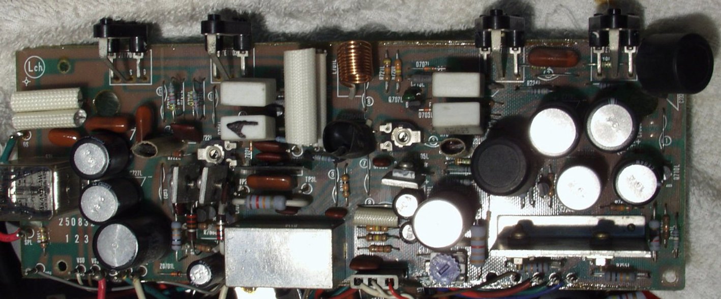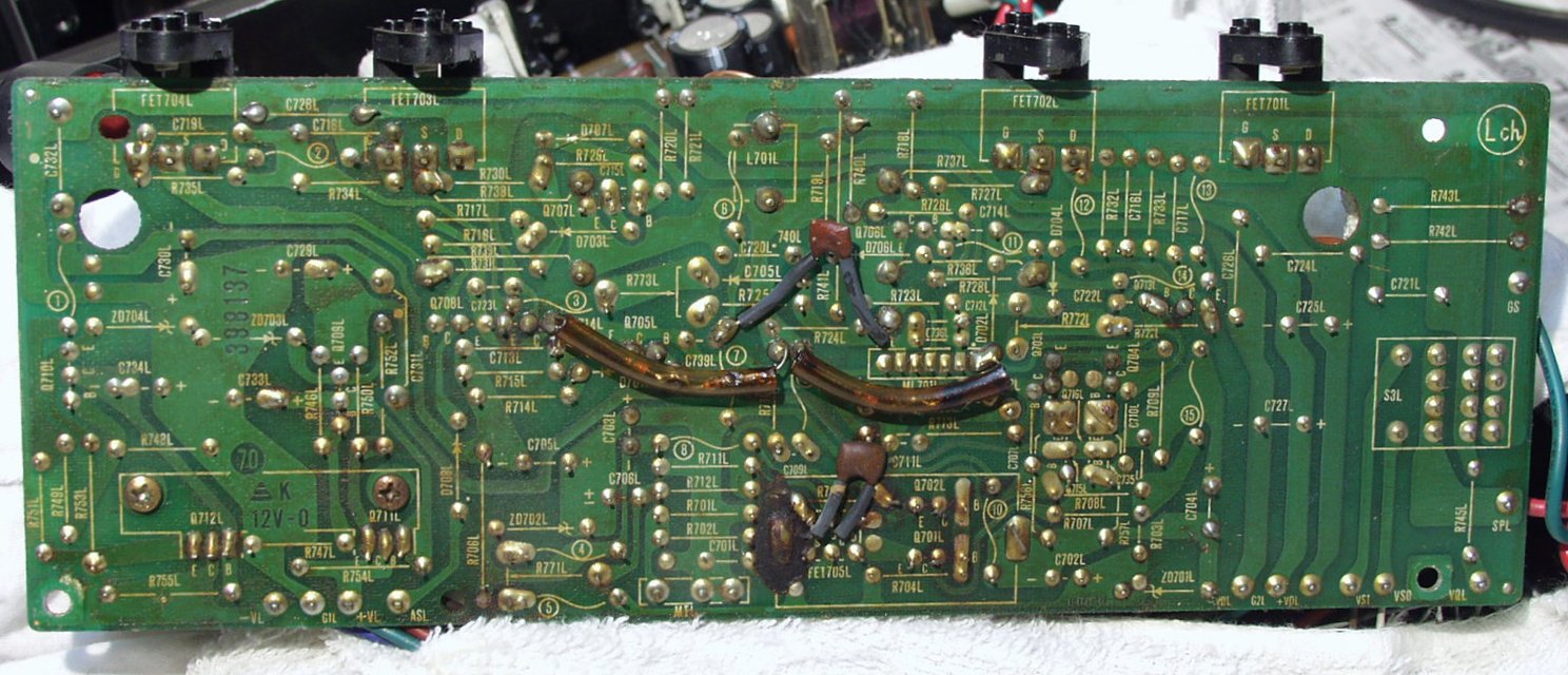 C−2A. 修理後 Lドライブ基板 初段FET、バランス/バイアス調整用半固定VR、SP接続リレー交換