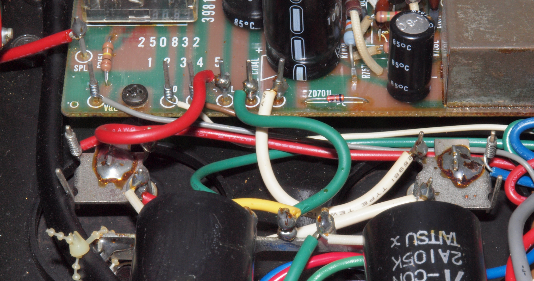 | A32. 点検中 電源トランスの詰め物を見る。左右共焼けは少し。 |