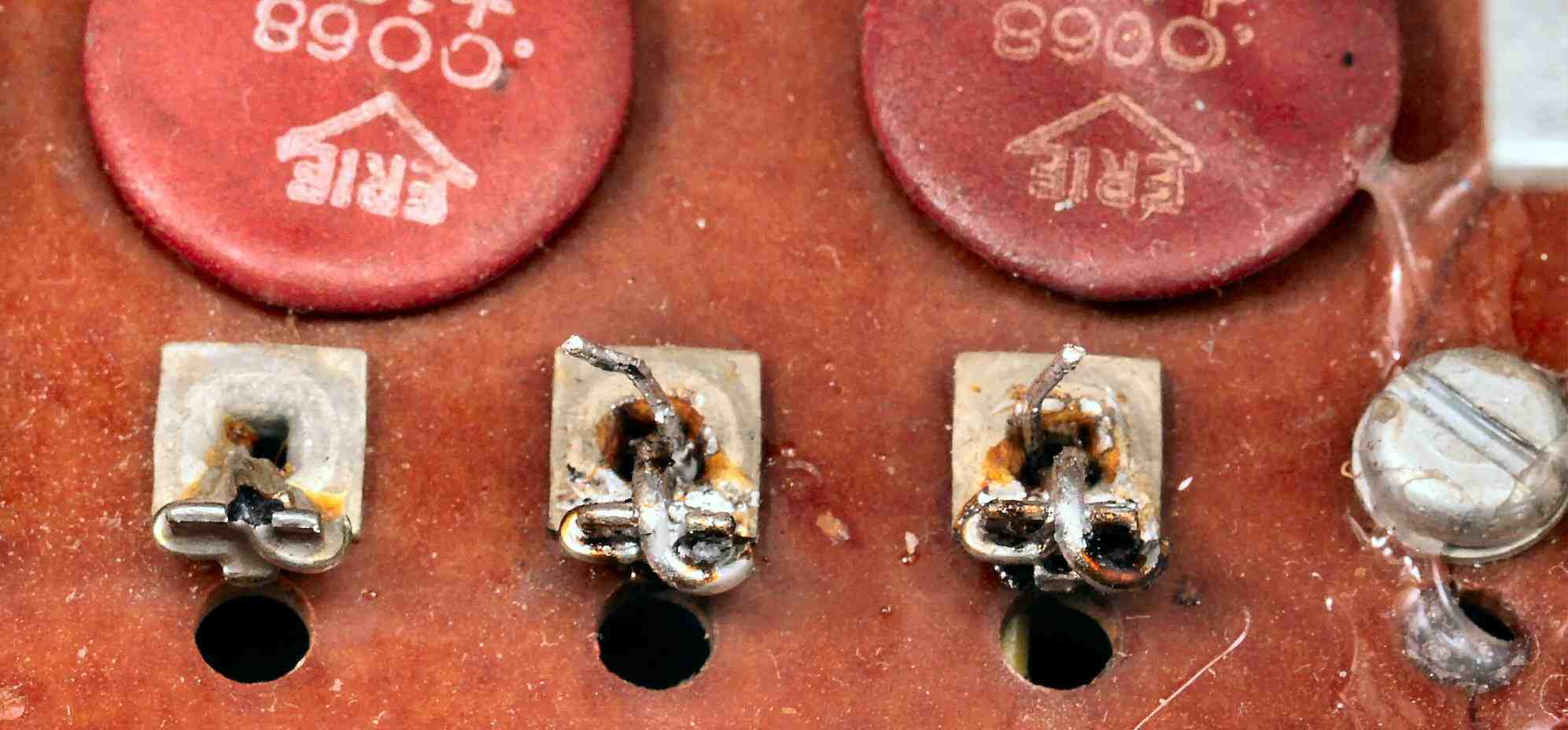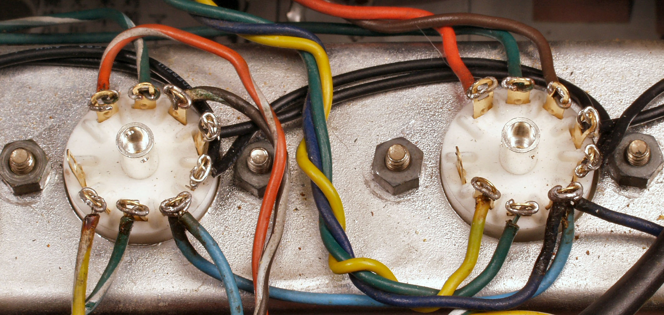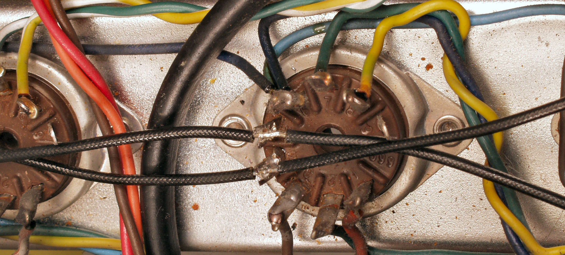 | C4A. 修理前 真空管MT9ピンソケット交換、ヒータ配線は、MTソケットのピンを割って線をはめ込んでいる |