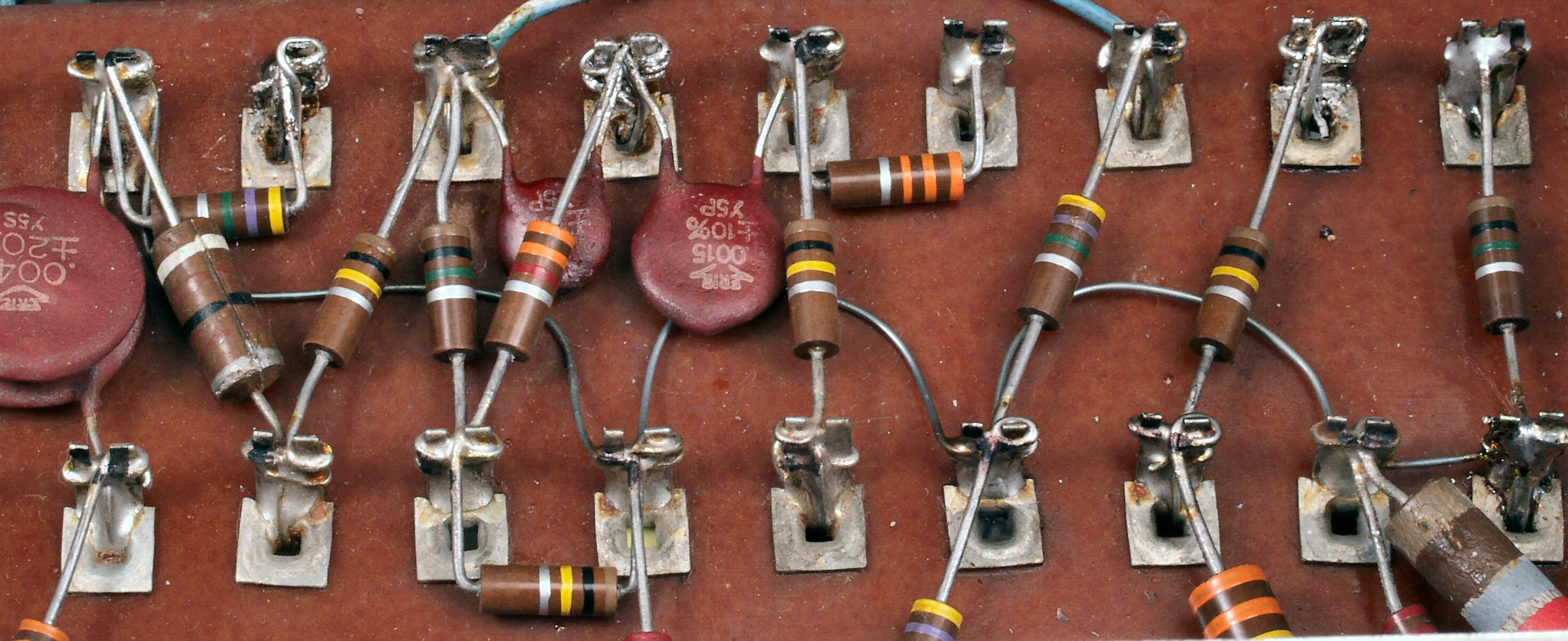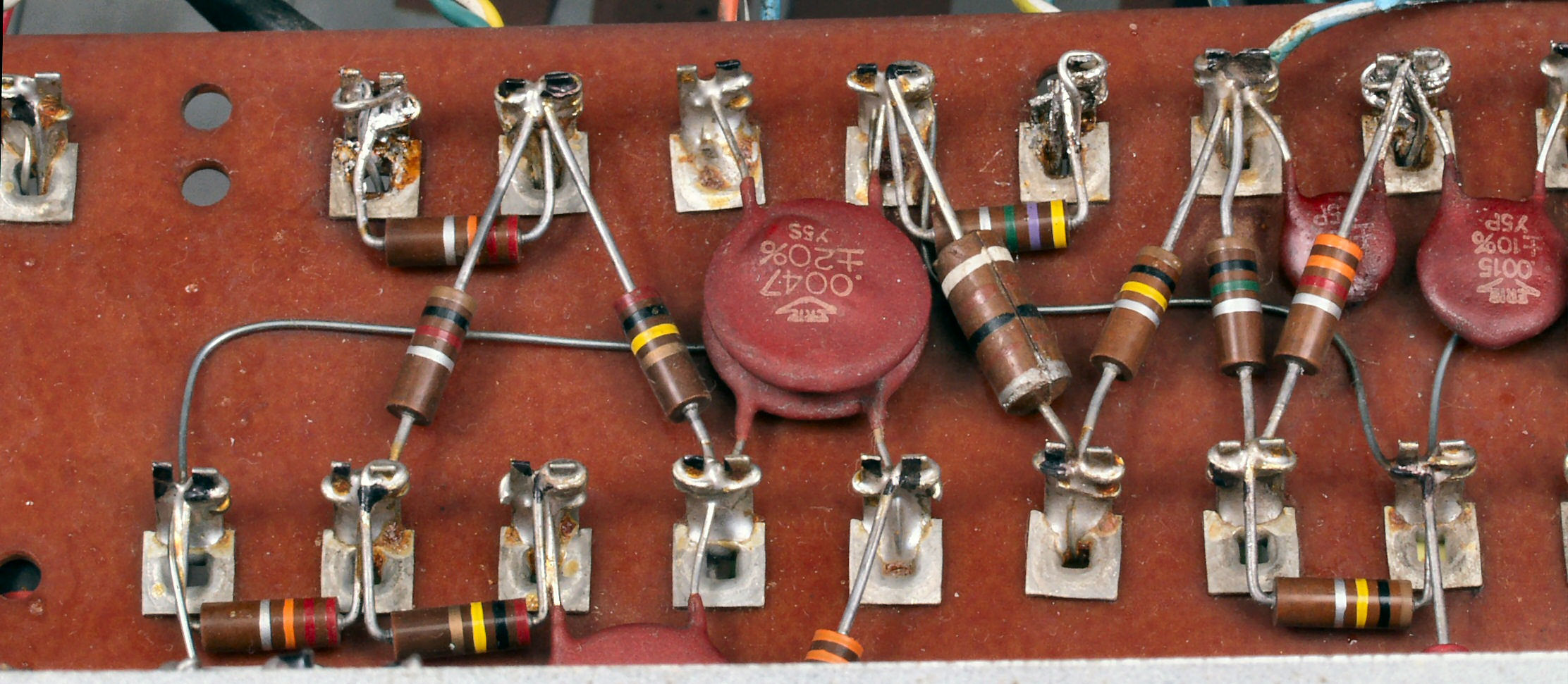 | C5A. 修理前 バッファーAMP、古い配線が外されていない、交換したコンデンサーの足は、差し込んだだけ! |