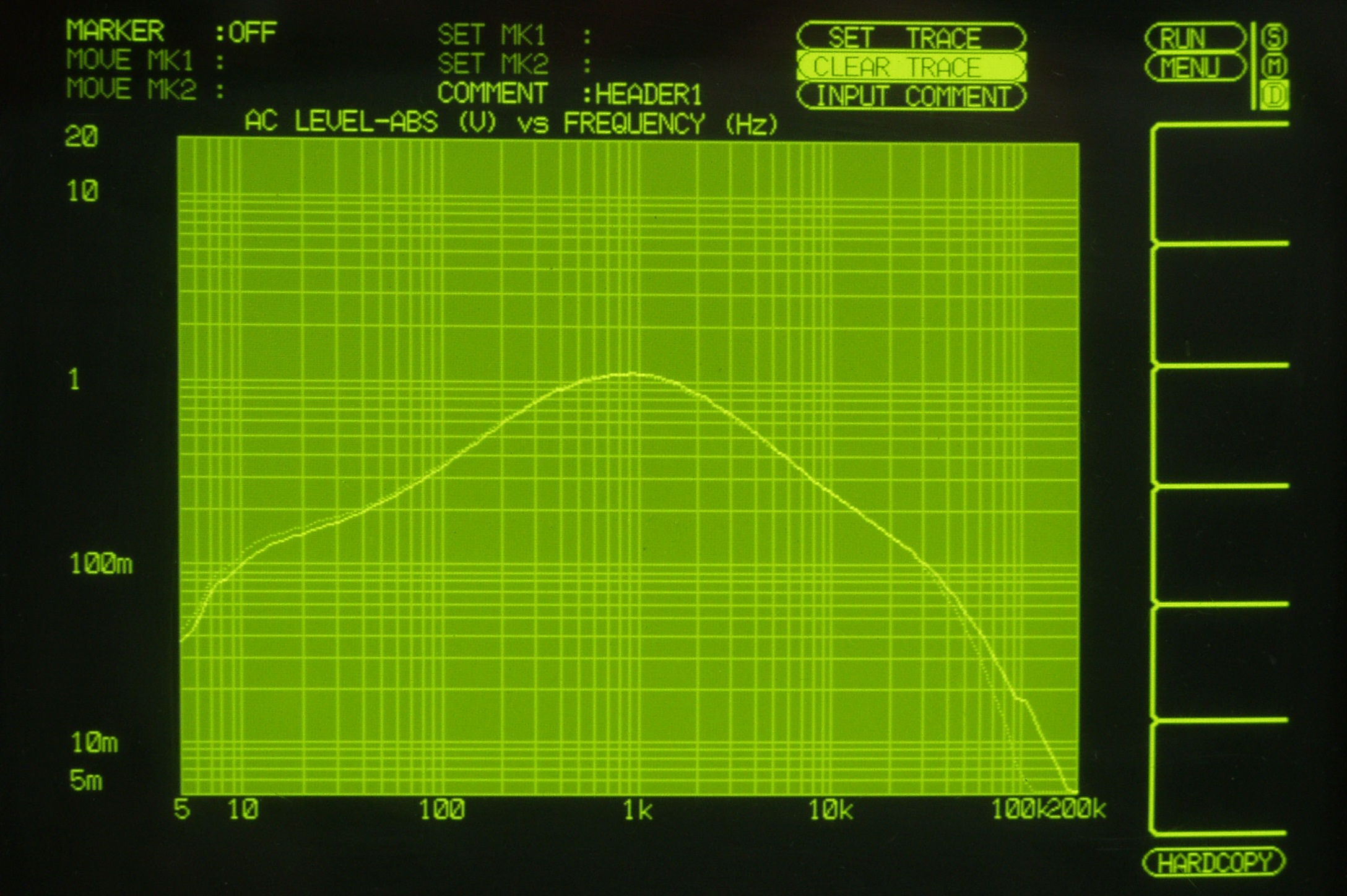 | F4A. 入出力特性測定(TAPE−HEAD入力) 入力電圧=2mV一定入力 VRはmax 左出力=薄(細い)色 右出力=濃い(太い)色 |