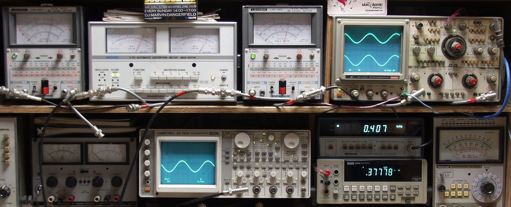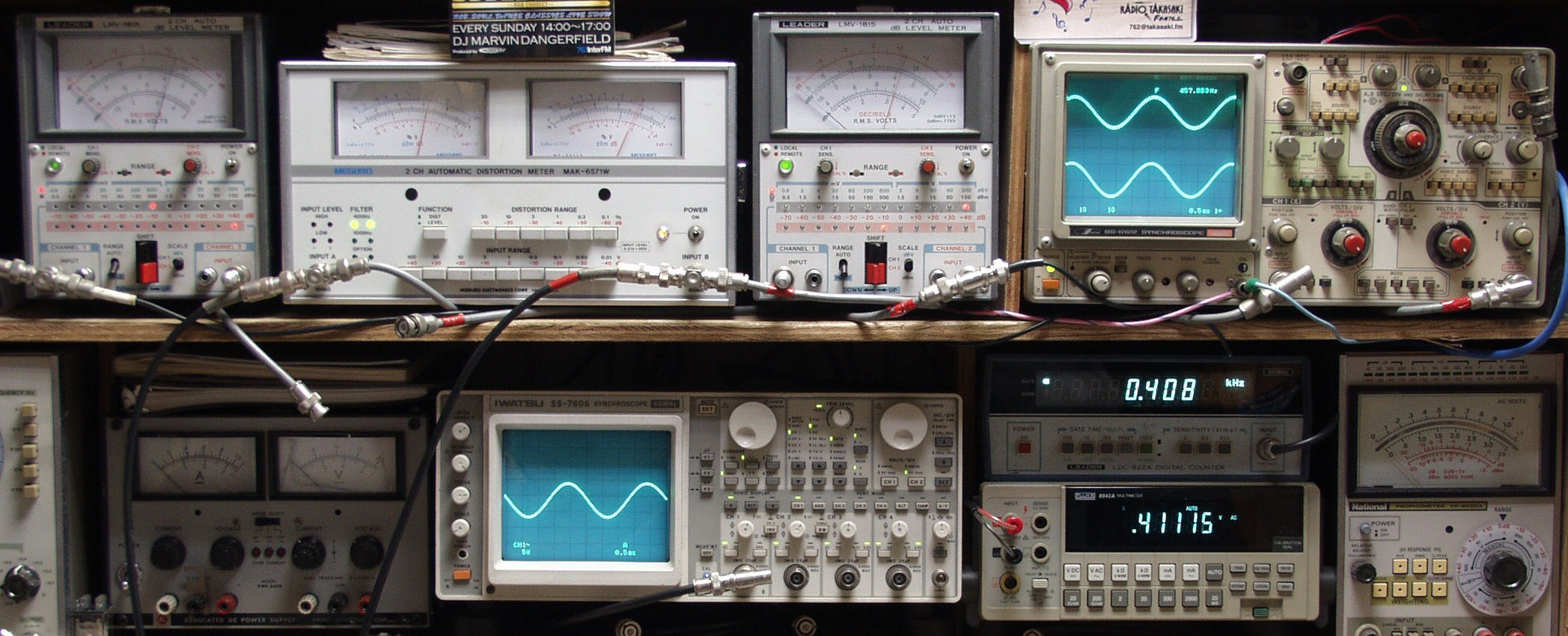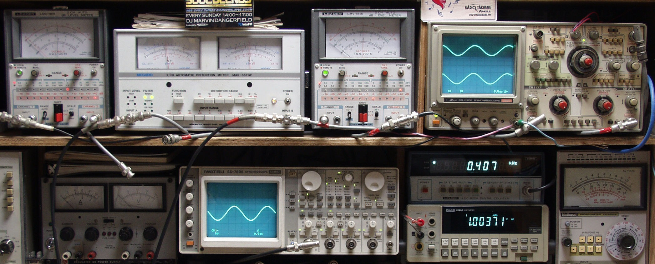 | E. 測定・調整 E1. 出力・歪み率測定・調整 <見方> 下左オーディオ発振器より400HZ・1KHZの信号を出し(歪み率=約0.003%)これをAMPに入力し、SPからの出力を測定 下中オシロ=入力波形(オーディオ発振器のTTLレベル) 下中右上=周波数計 下中右上デジタル電圧計=SP出力電圧測定RLは切り替えて測定 上左端電圧計=L側SP出力電圧測定、黒針のみ使用 上中左歪み率計=SP出力の歪み率測定 左メータ=L出力、右メータ=R出力 上中右=R側SP出力電圧測定、赤針のみ使用 上右端オシロ=SP出力波形 上=R出力、下=L出力 |