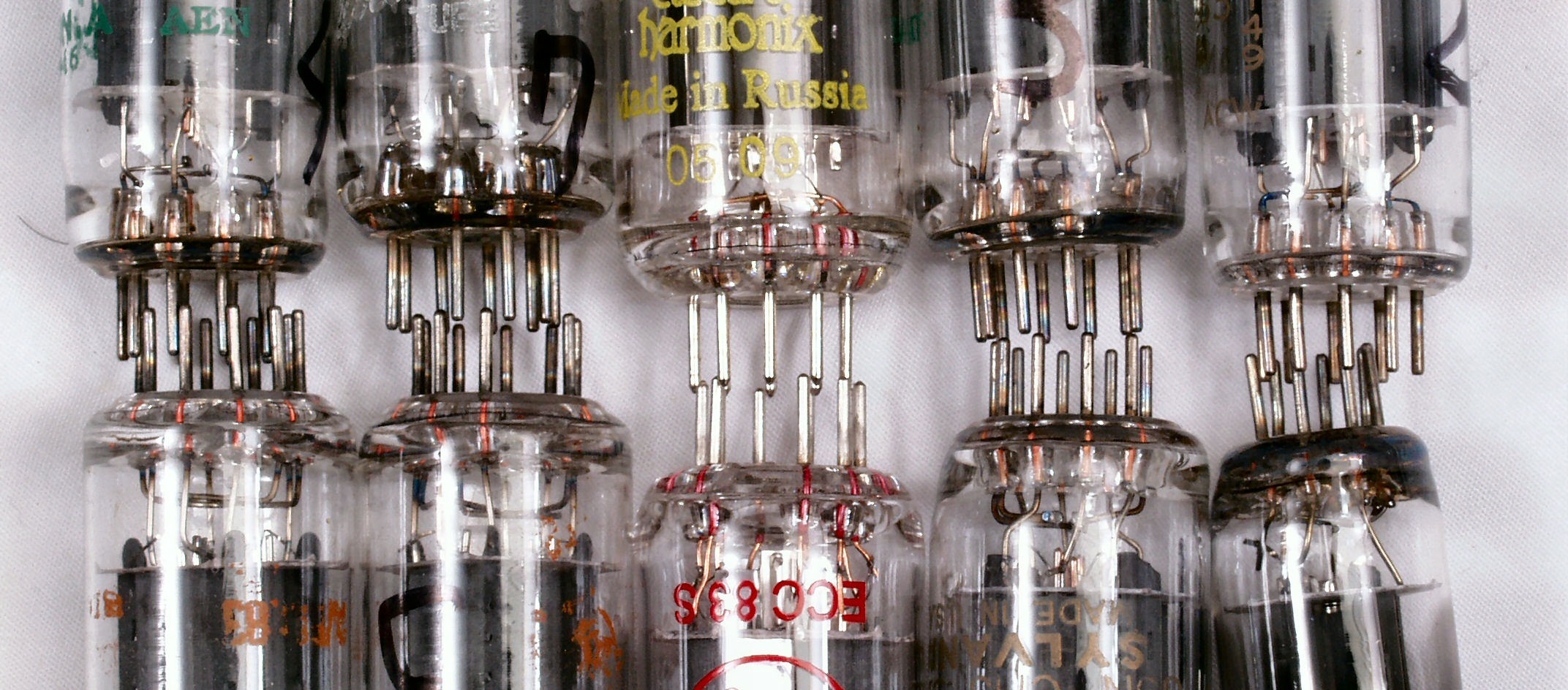 | A3B. 点検中 真空管の比較、真ん中の上下2本が手持ち新品。 足(ピン)の腐食とその上の袴の部分の黒ずみで、使用時間が推測できる |