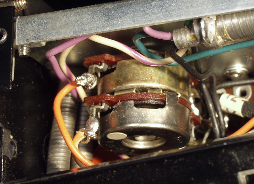 | C6B. 修理をしてあるメインVR ケースの色が違う。 「カシメ」が緩んでいるが素人ではこの程度、カシメは1度しか修理出来ない 2回目は必ず折れる。抵抗体に傷が有る様子で抵抗変化が左右で異なるカーブ |