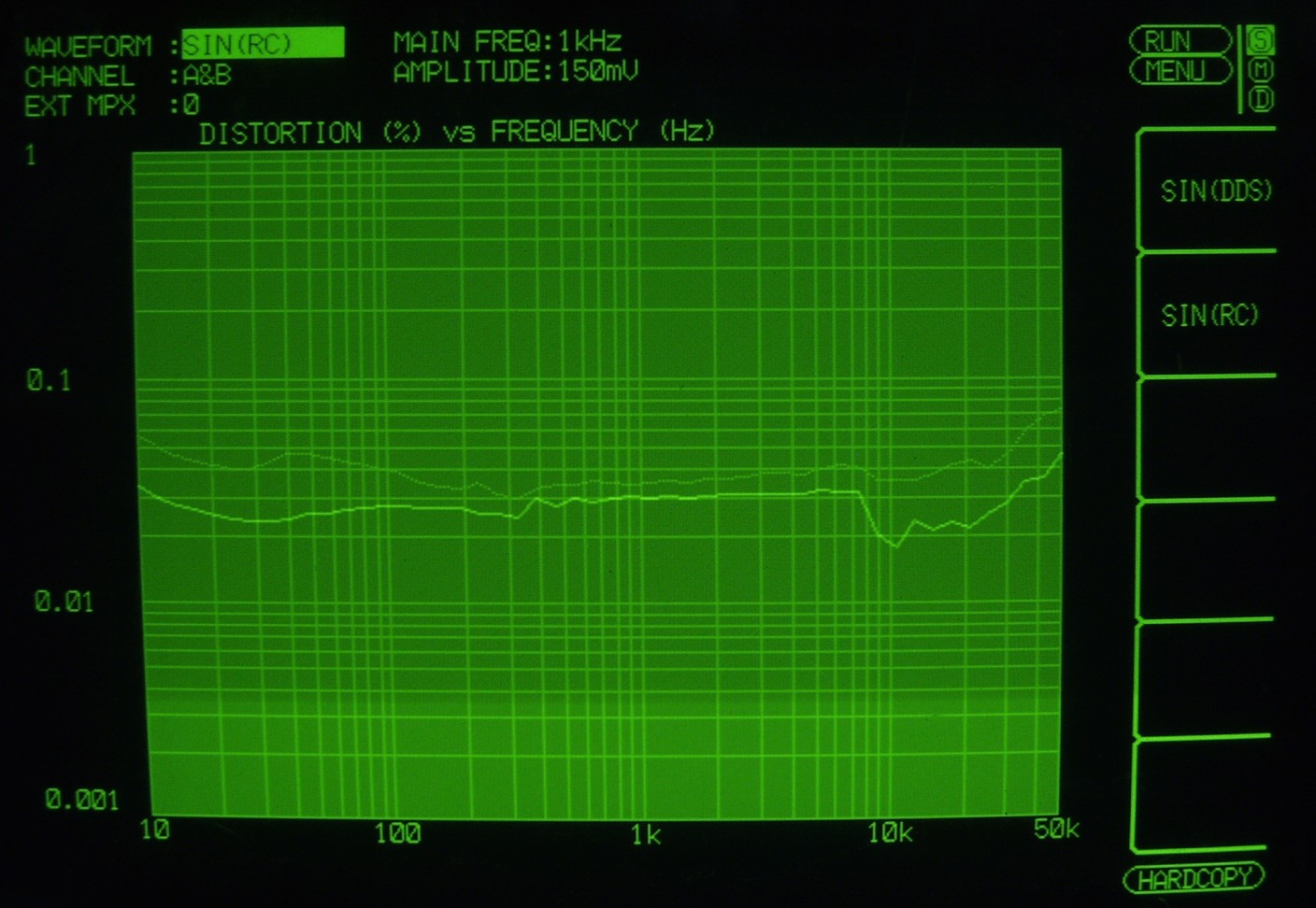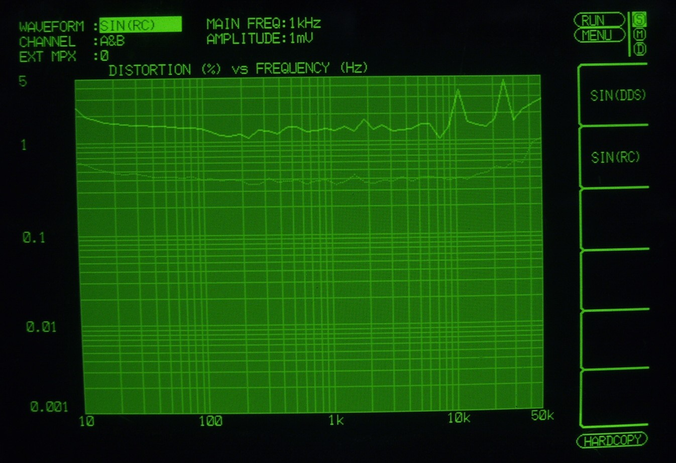 | F3B. 歪み率測定 MM入力 左出力=薄(細い)色 右出力=濃い(太い)色 MM入力端子に0.8mV一定入力 VRはmax この測定器は入力レベルが変化すると、正しく測定できない、 入力に逆RIAAフイルタ−を入れ、入力レベルを一定にしないと、正確な測定は出来ないので参考程度 |