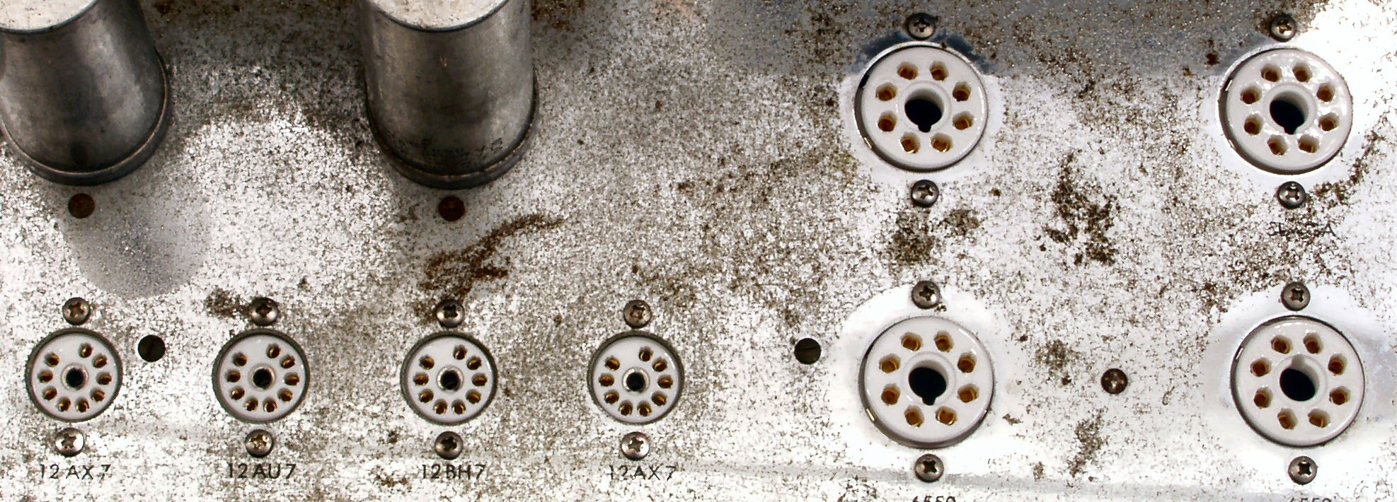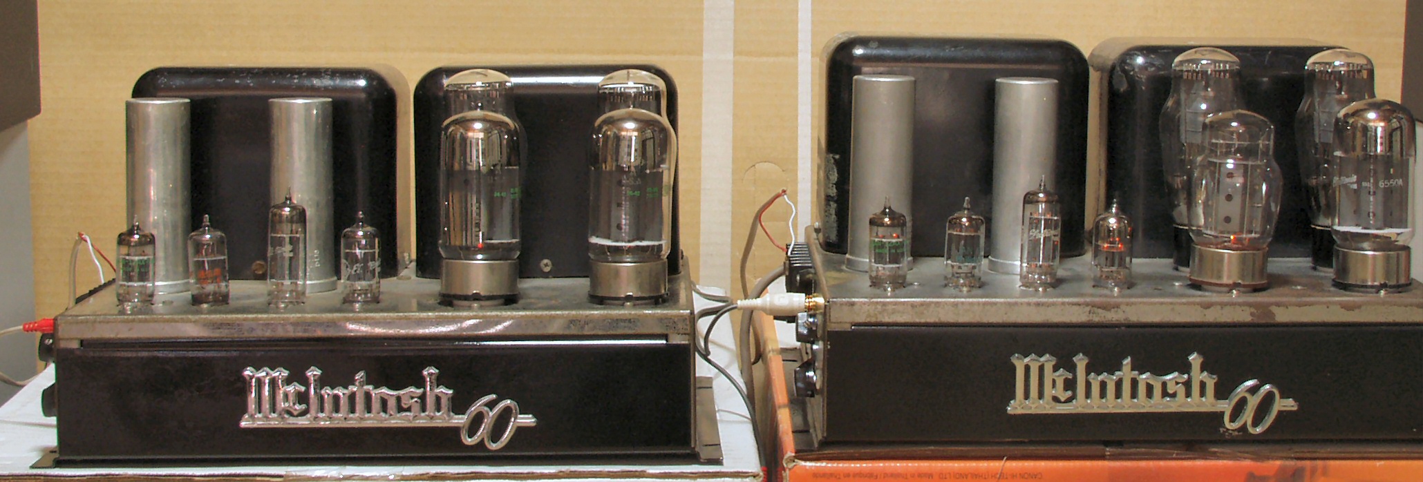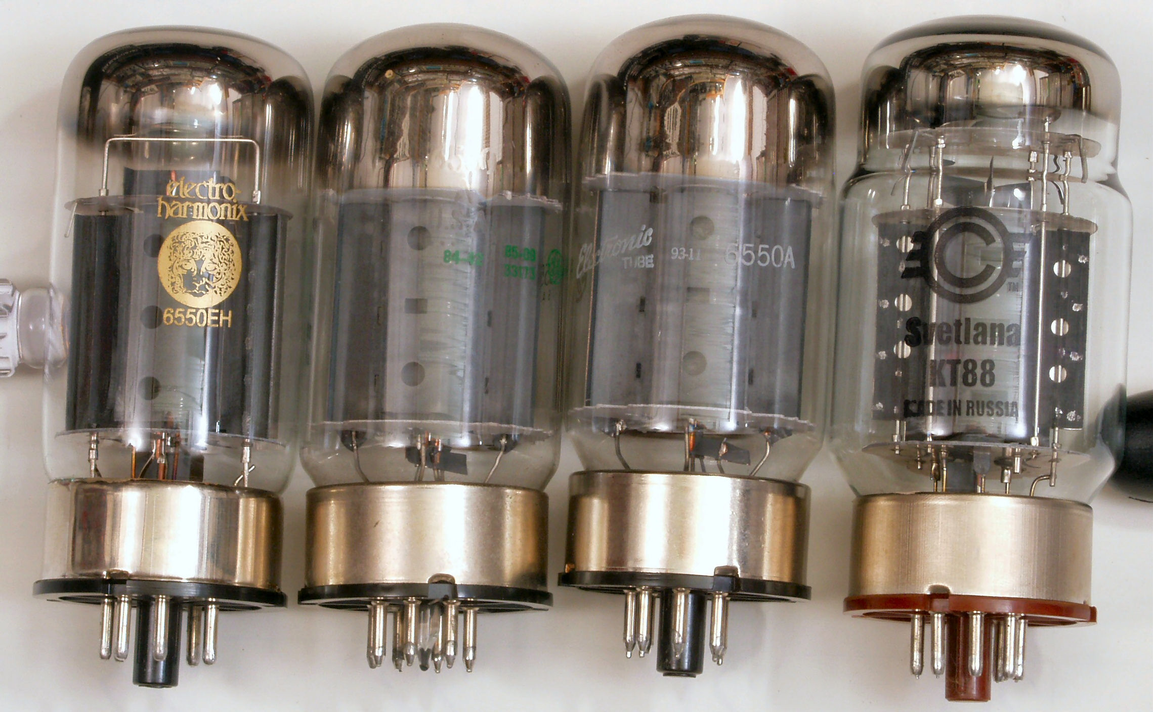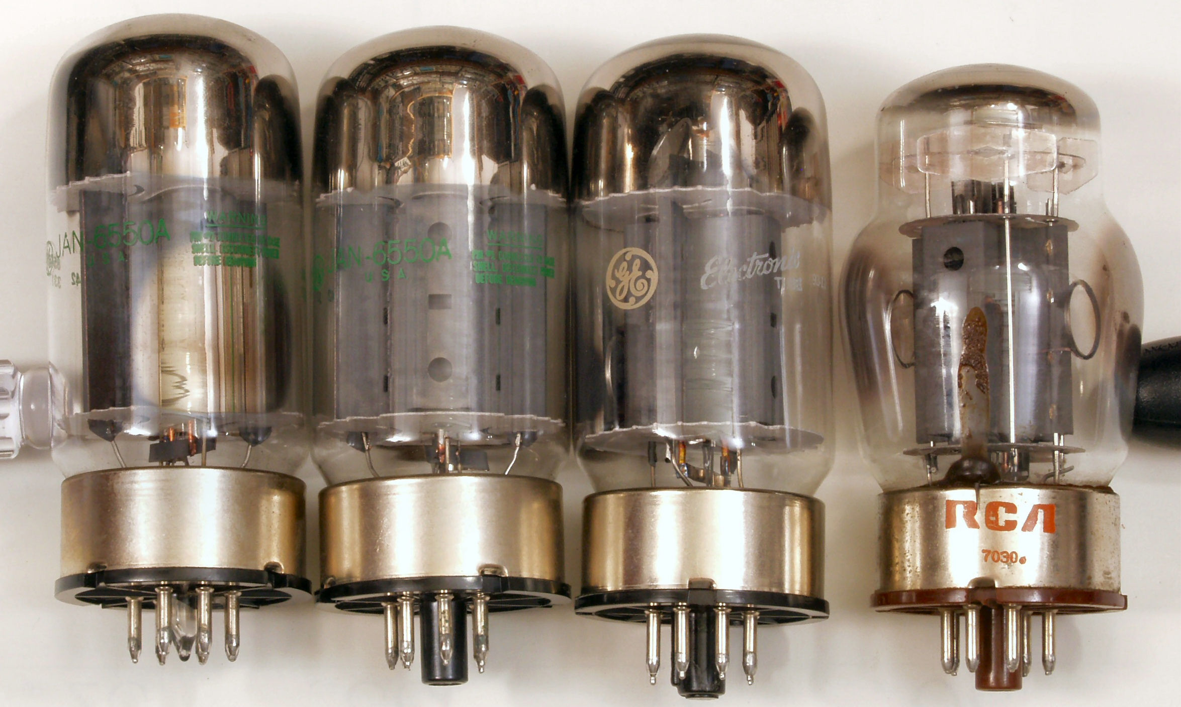 | A53. 点検中 点検中 出力管6550 の比較、左端は新品の6550、右端は新品のKT88 |