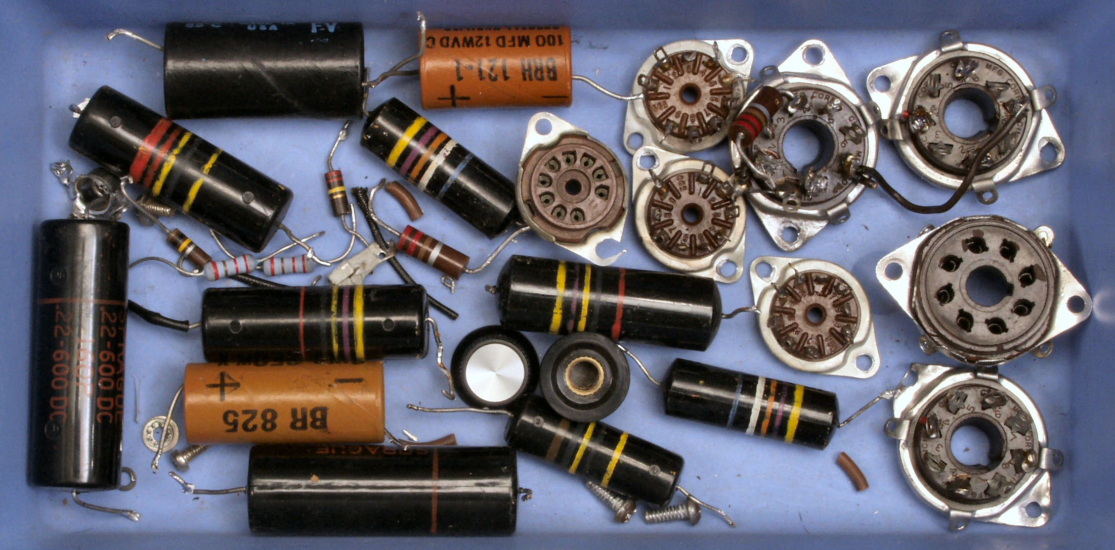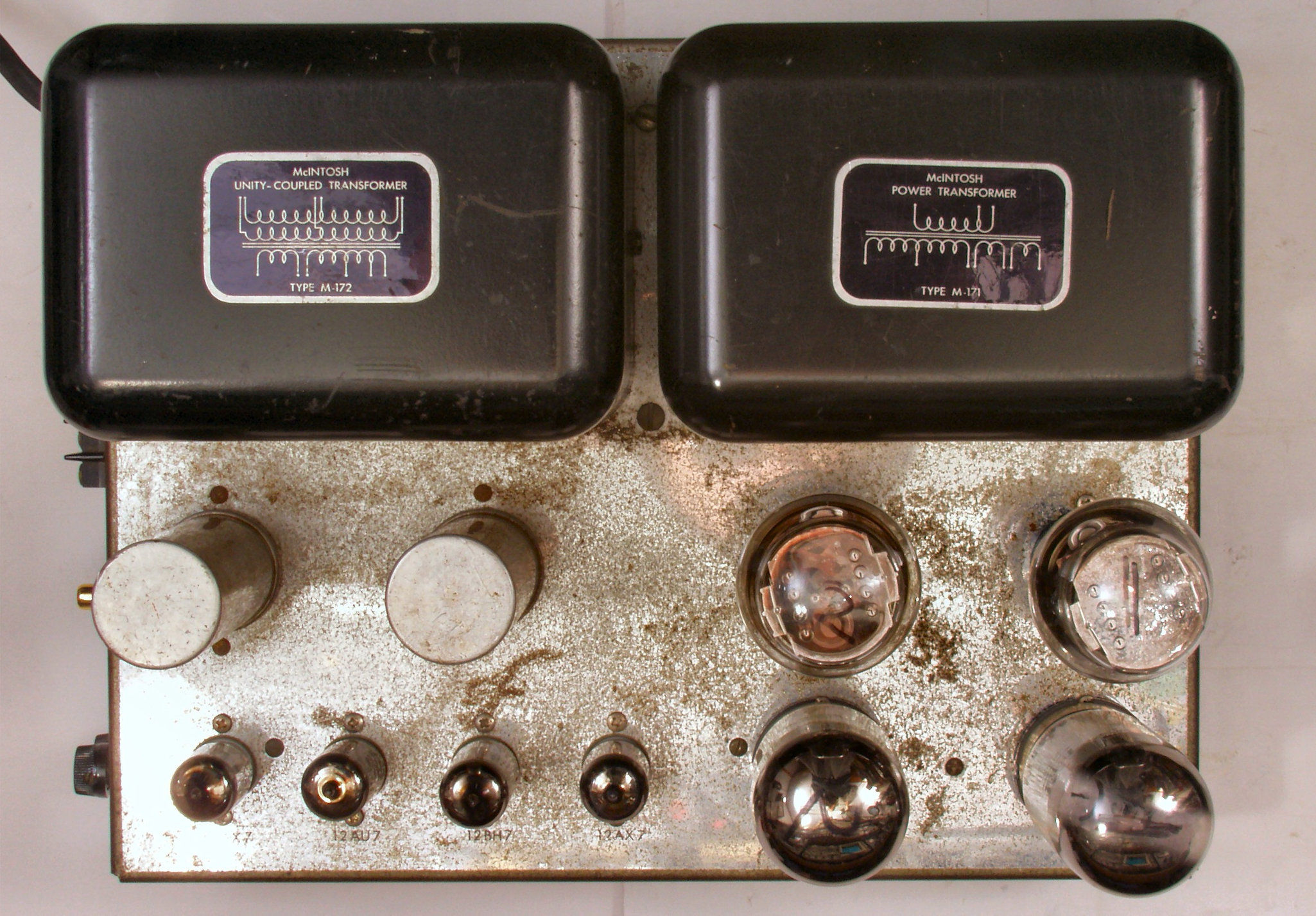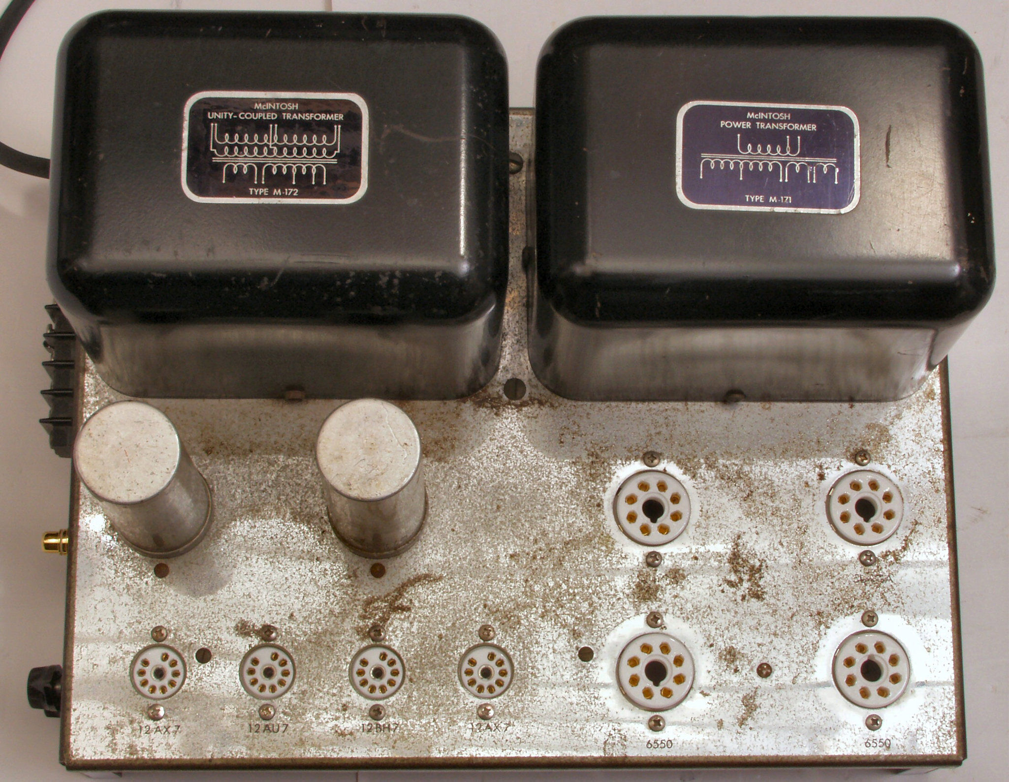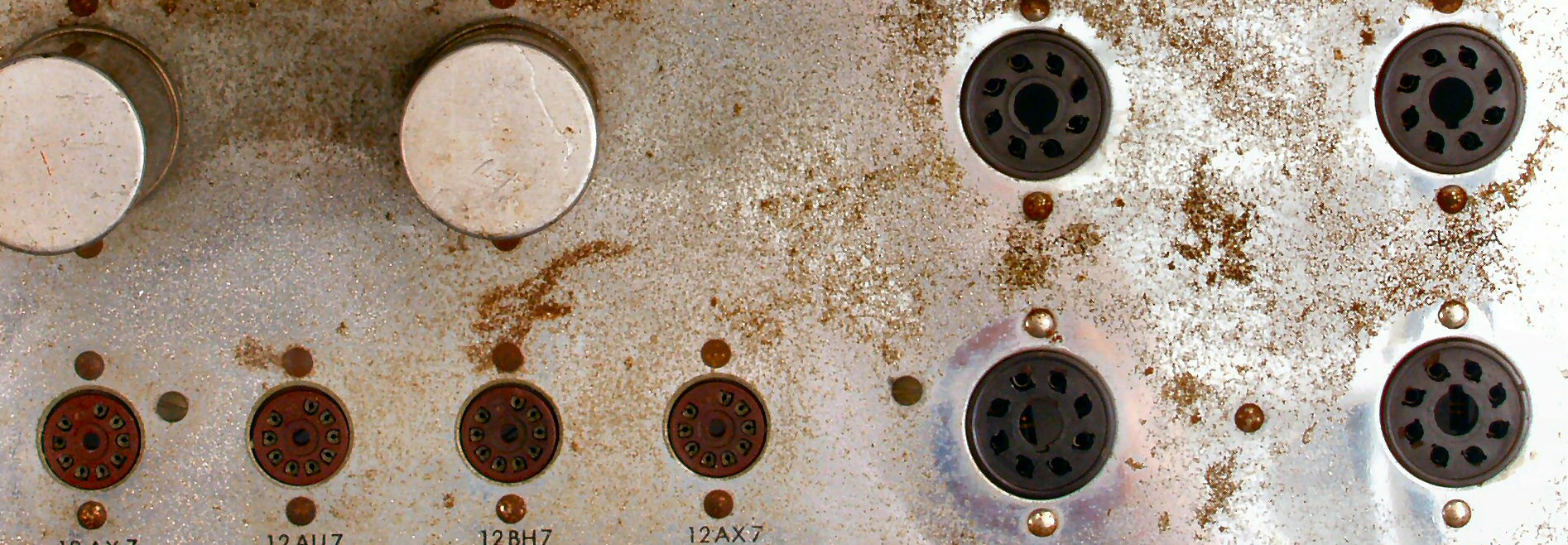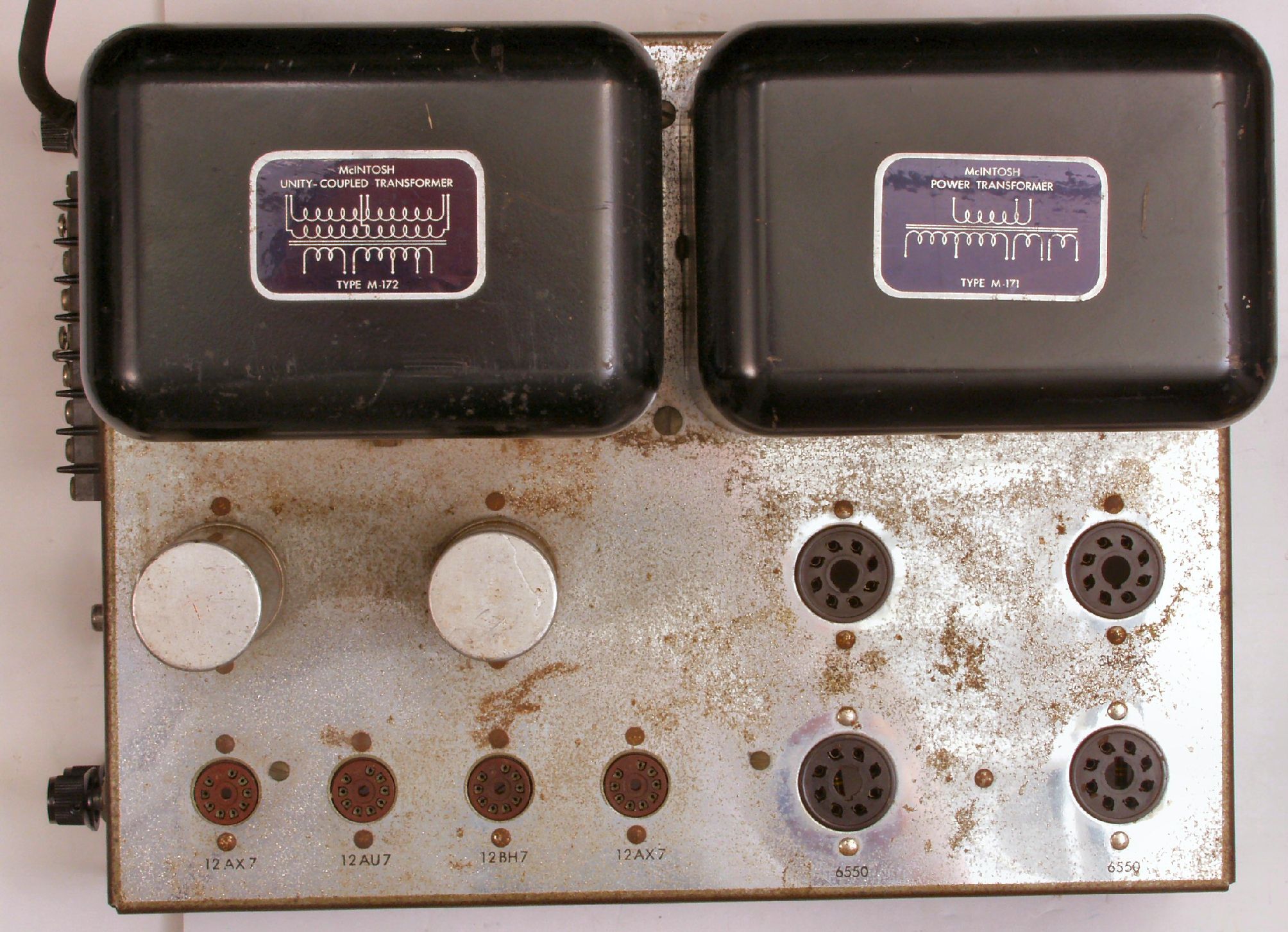 | A53. 点検中 点検中 出力管6550 の比較、左端は新品の6550、右端は新品のKT88 |