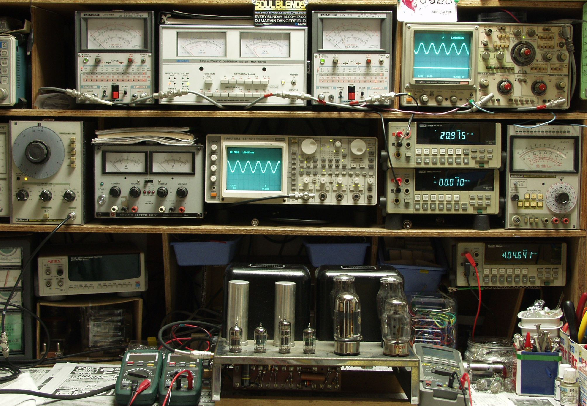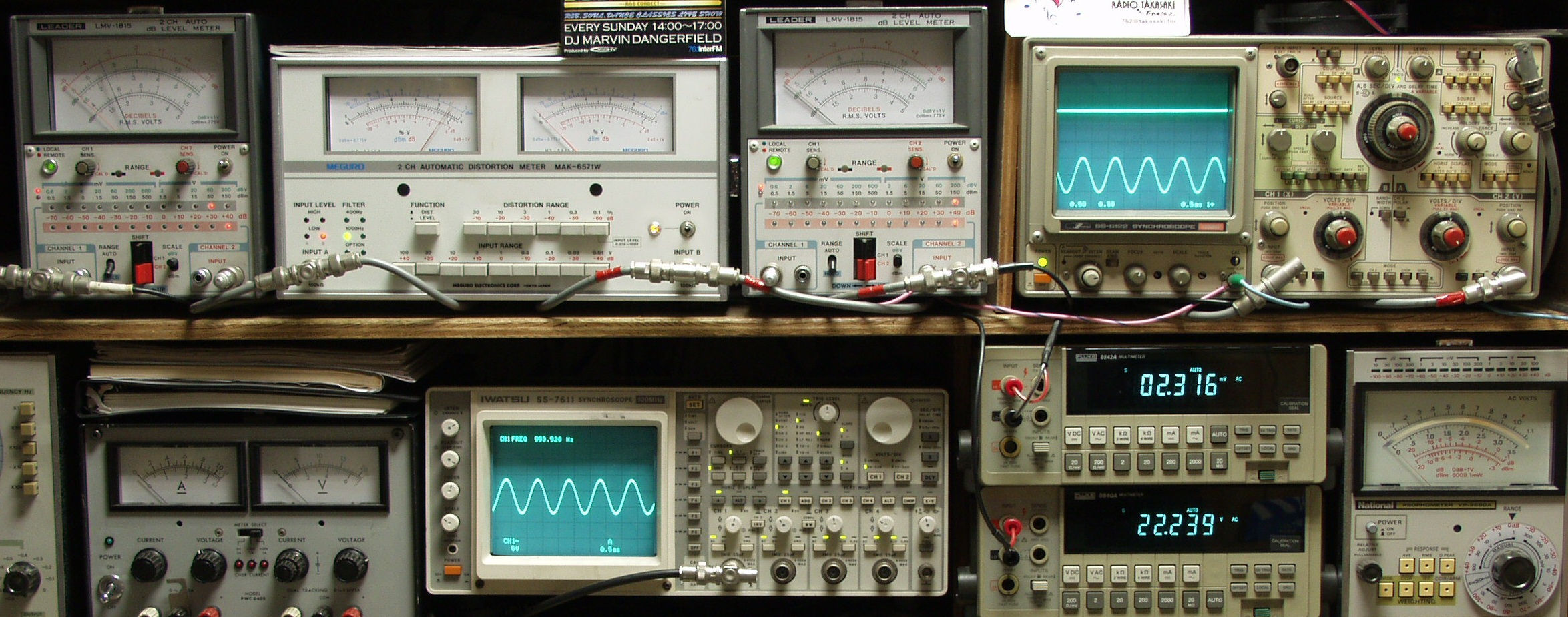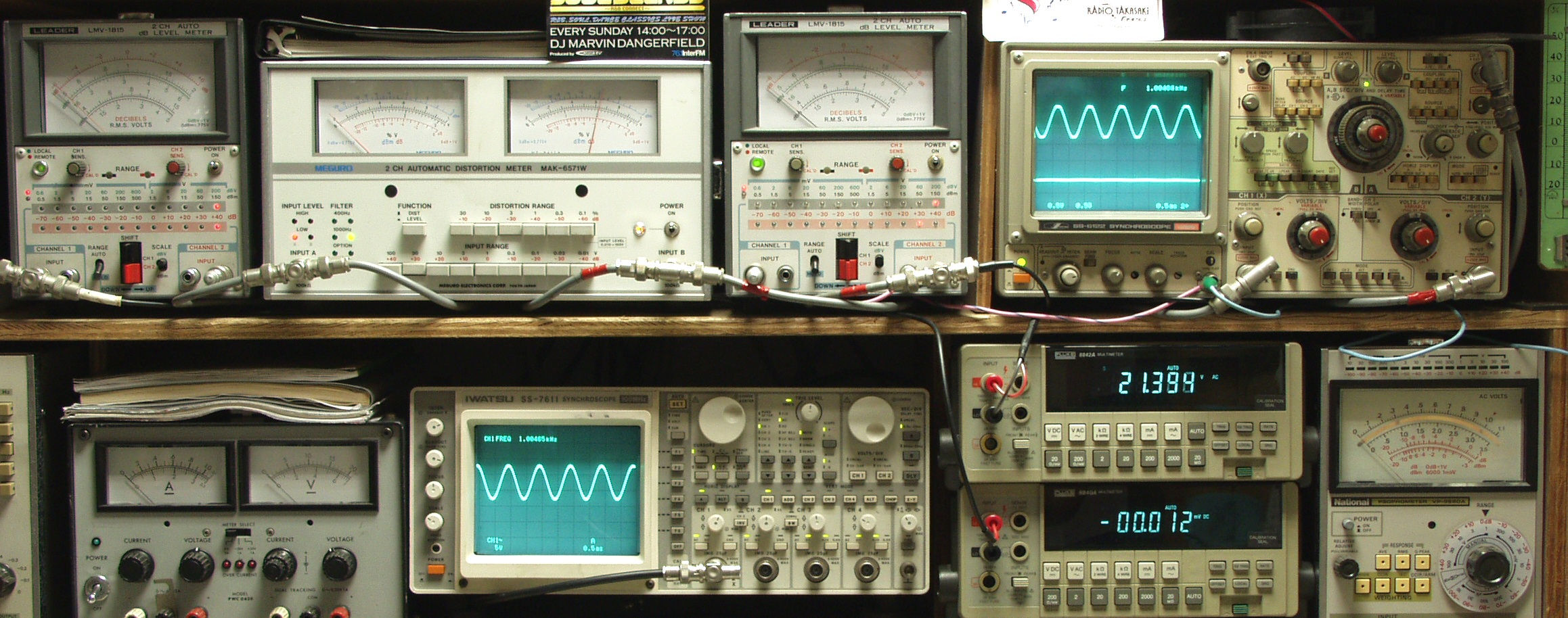 | T. 修理前の測定 T1. 出力・歪み率測定 <見方> 下段左端 オーディオ発振器より400HZ・1KHZの信号を出し(歪み率=約0.003%)これをAMPに入力し、出力を測定 下段中左 オシロ=入力波形(オーディオ発振器のTTLレベル) 下段中右上=周波数計 上段左端 電圧計=L側出力電圧測定、黒針のみ使用 上段中左 歪み率計=出力の歪み率測定 左メータ=L出力、右メータ=R出力 上段中右 電圧計=R側出力電圧測定、赤針のみ使用 上段右端 オシロ=出力波形 上=R出力、下=L出力(実際にはRL電圧計の出力「Max1V」を観測) 下段中右上 デジタル電圧計=R出力電圧測定 下段中右下 デジタル電圧計=L出力電圧測定 |