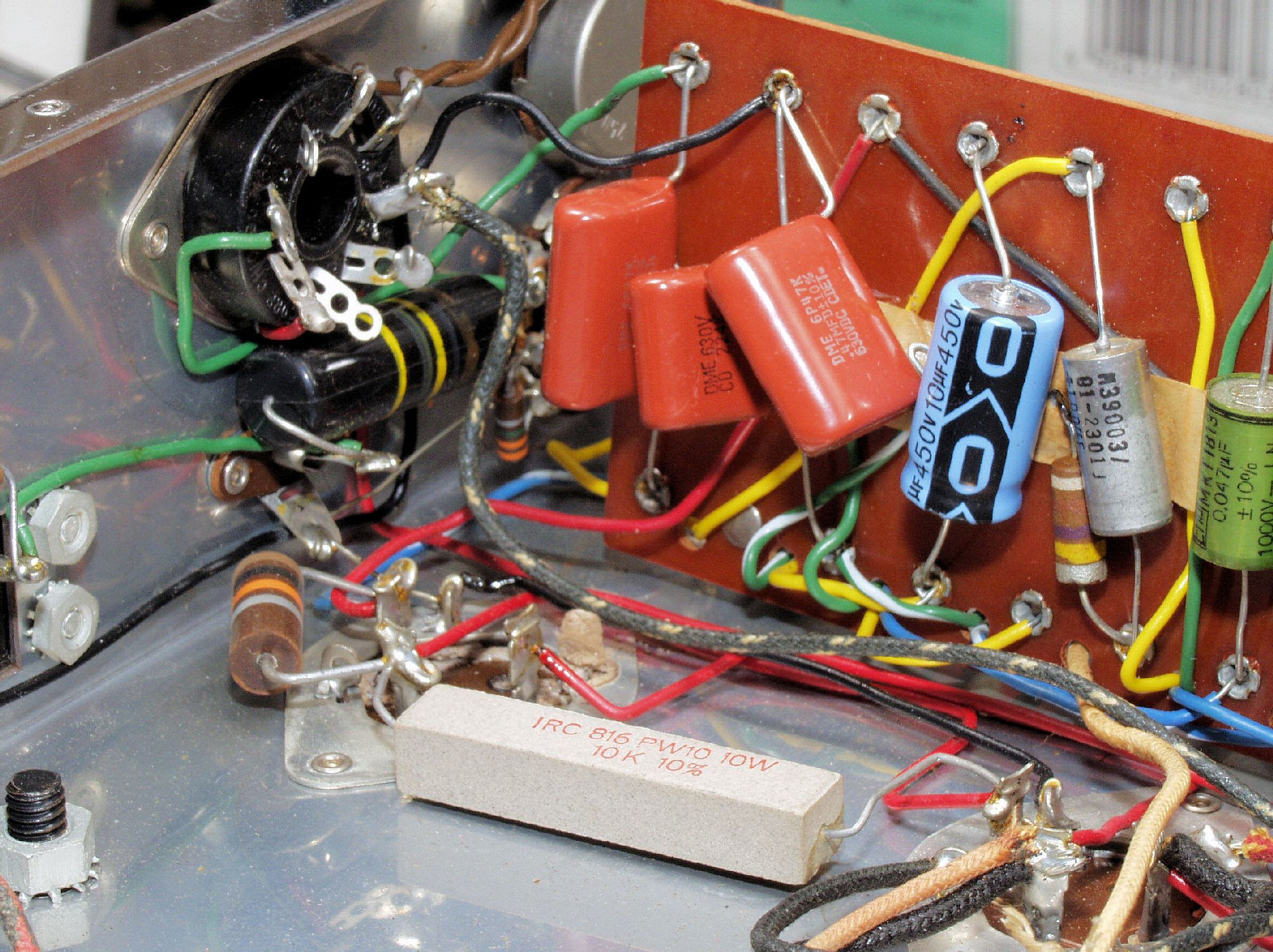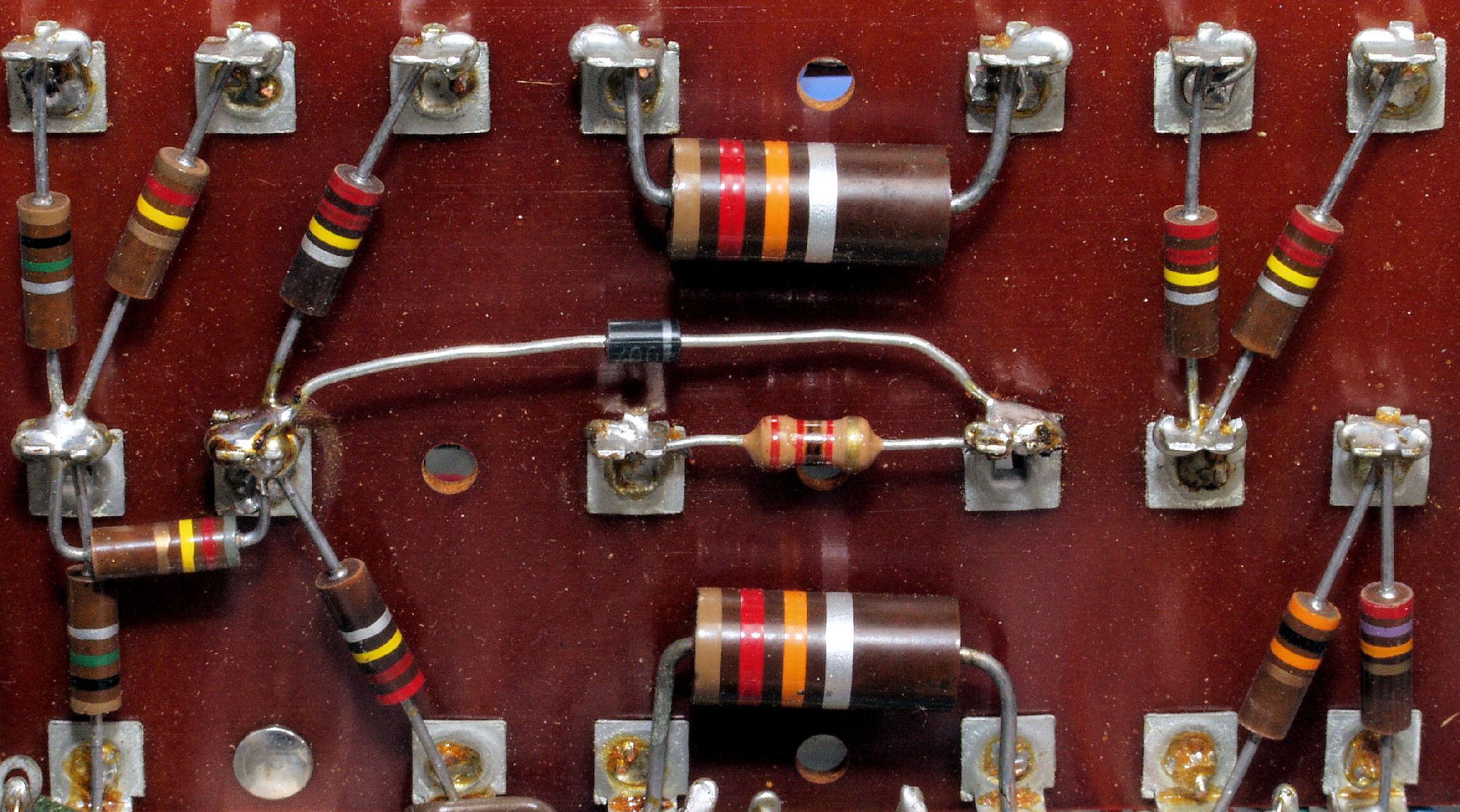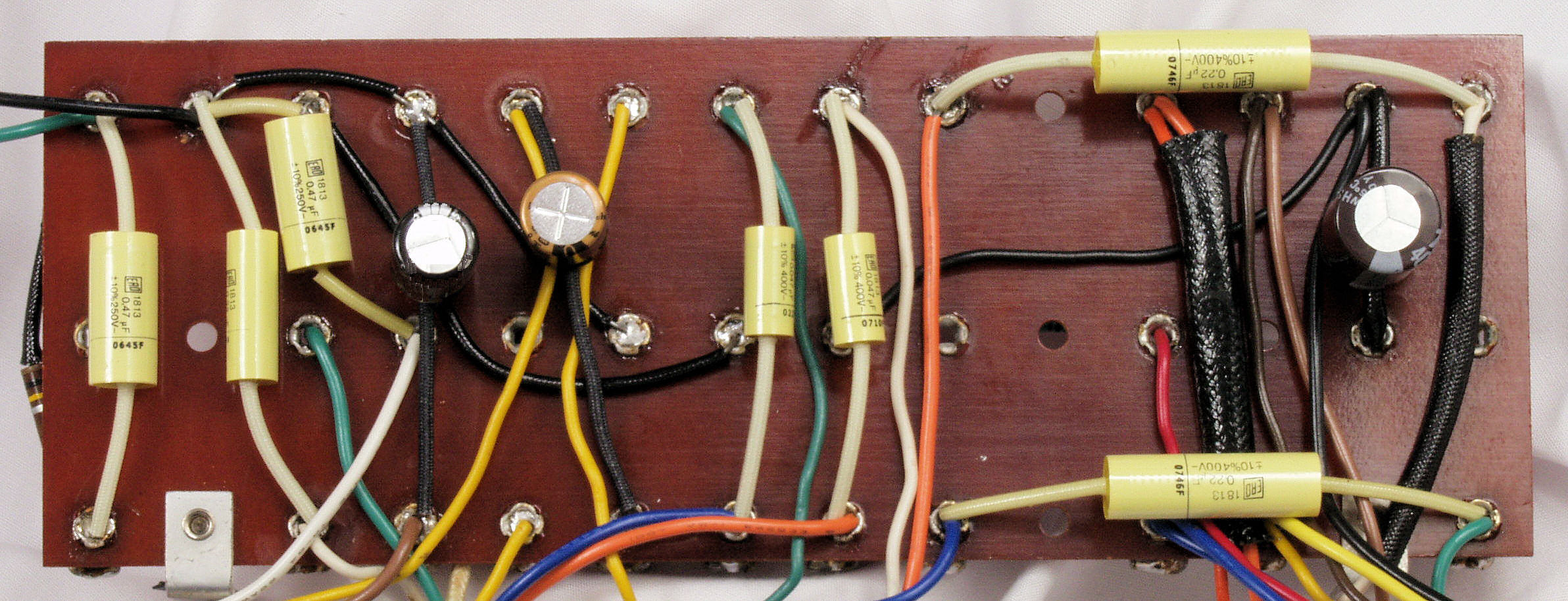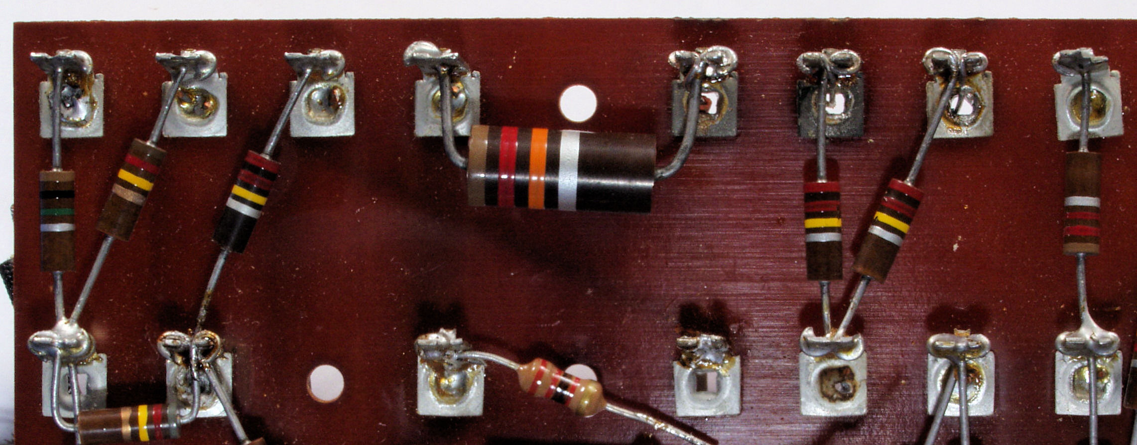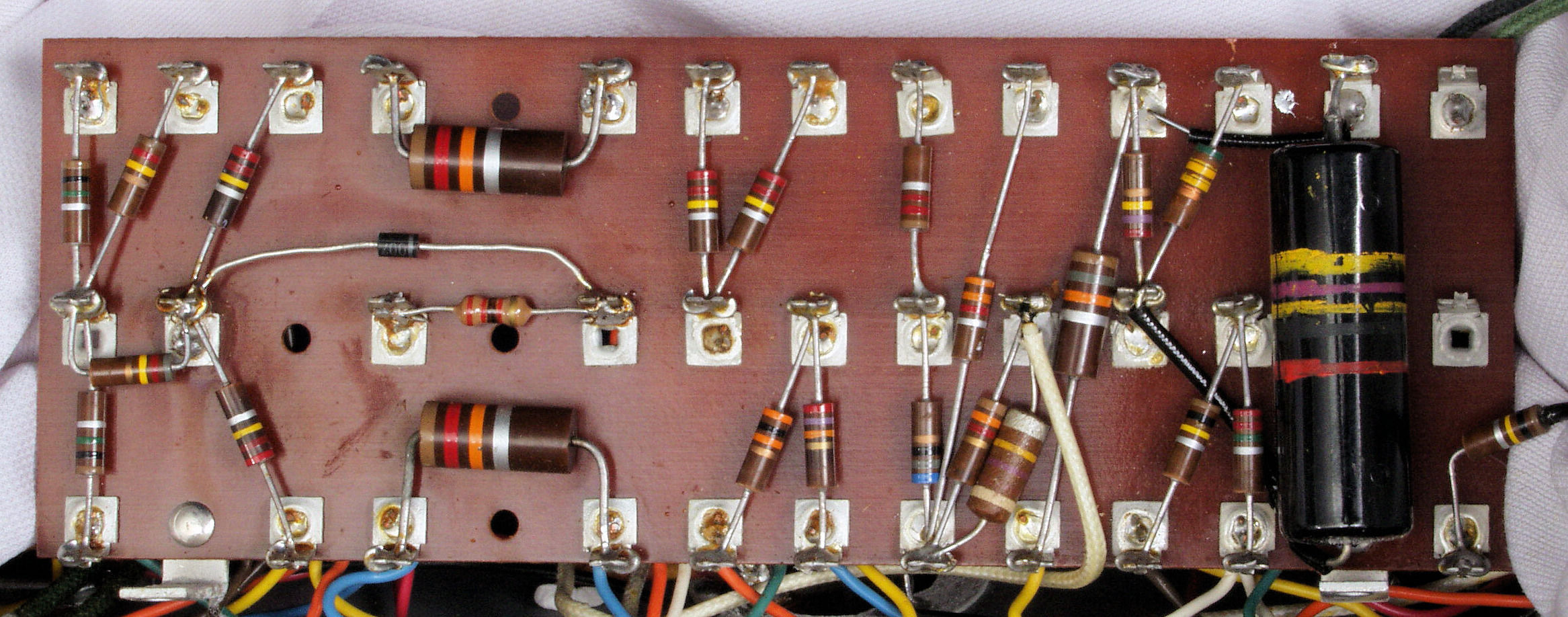 C33. 修理中 基板裏、 コンデンサー・抵抗や渡り線が鳩目で半田止め、端子に絡げていない。