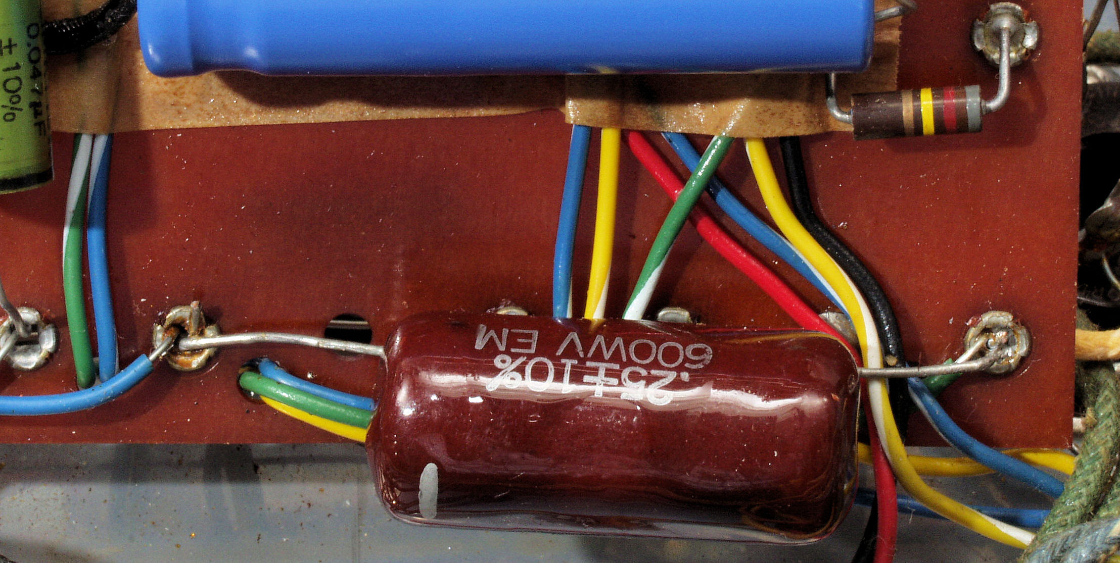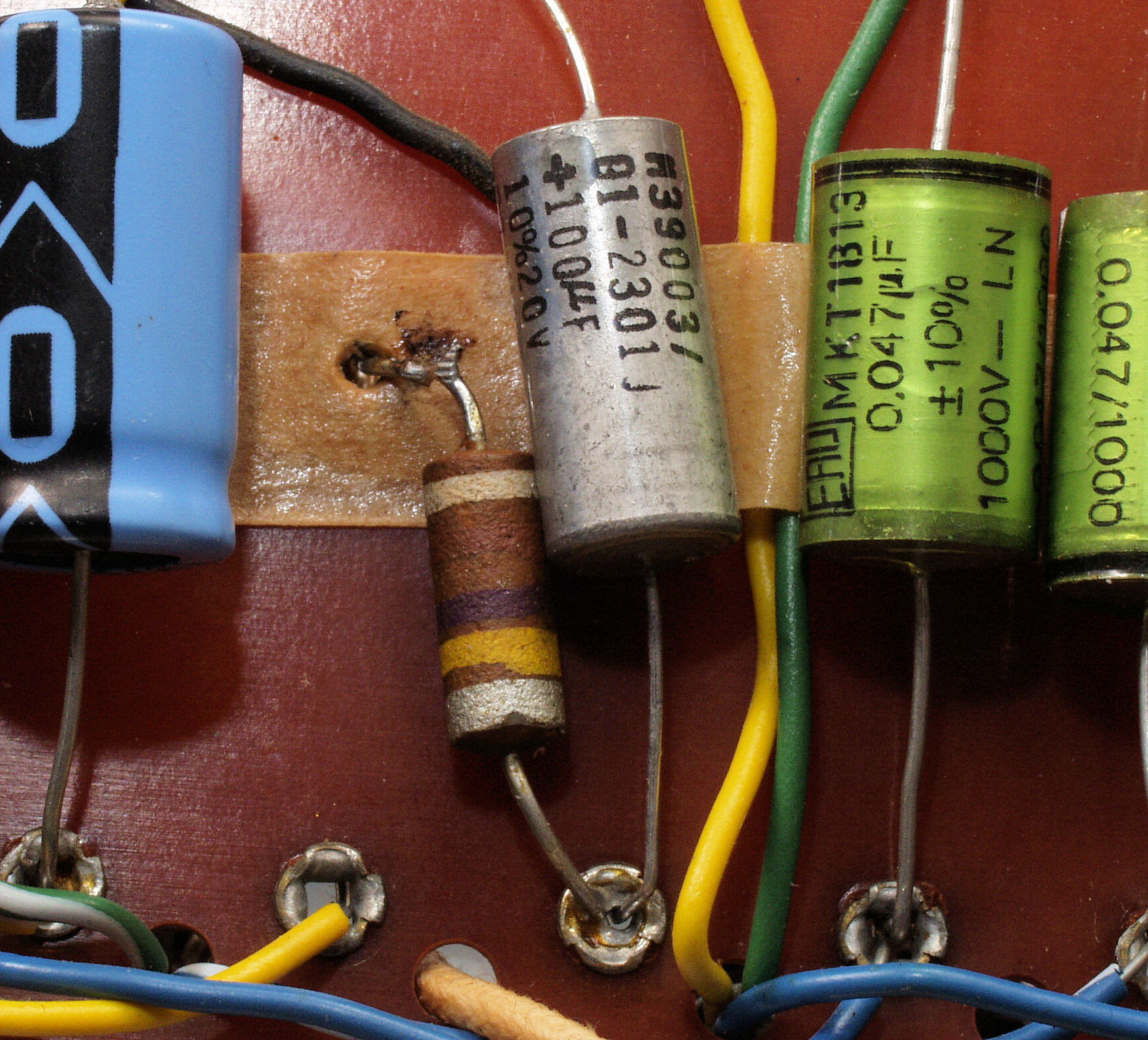 C313. 修理中 交換された電解コンデンサー、前のリード線を取っていない