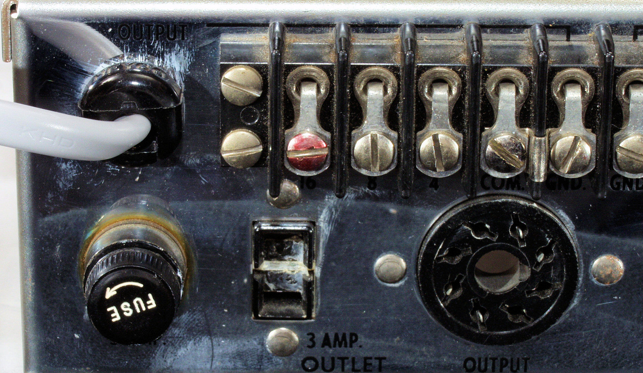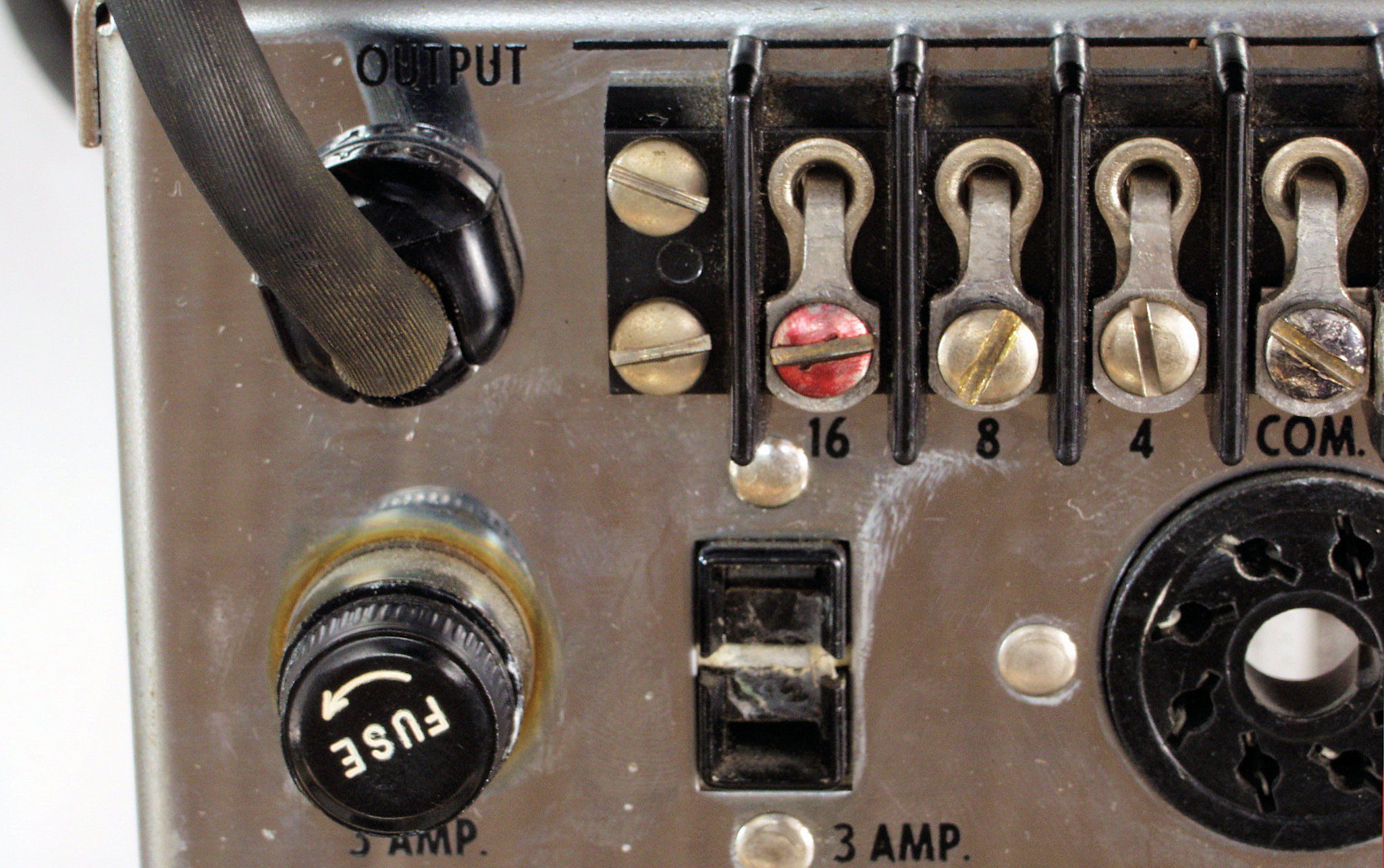 下段左端 オーディオ発振器より400HZ・1KHZの信号を出し(歪み率=約0.003%)これをAMPに入力し、出力を測定