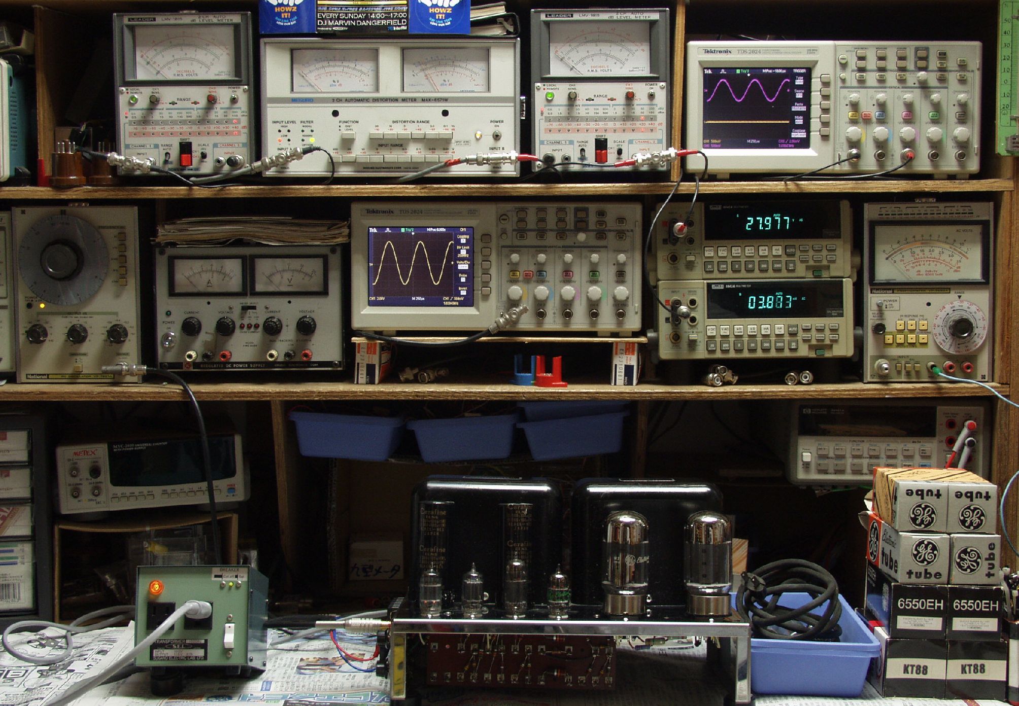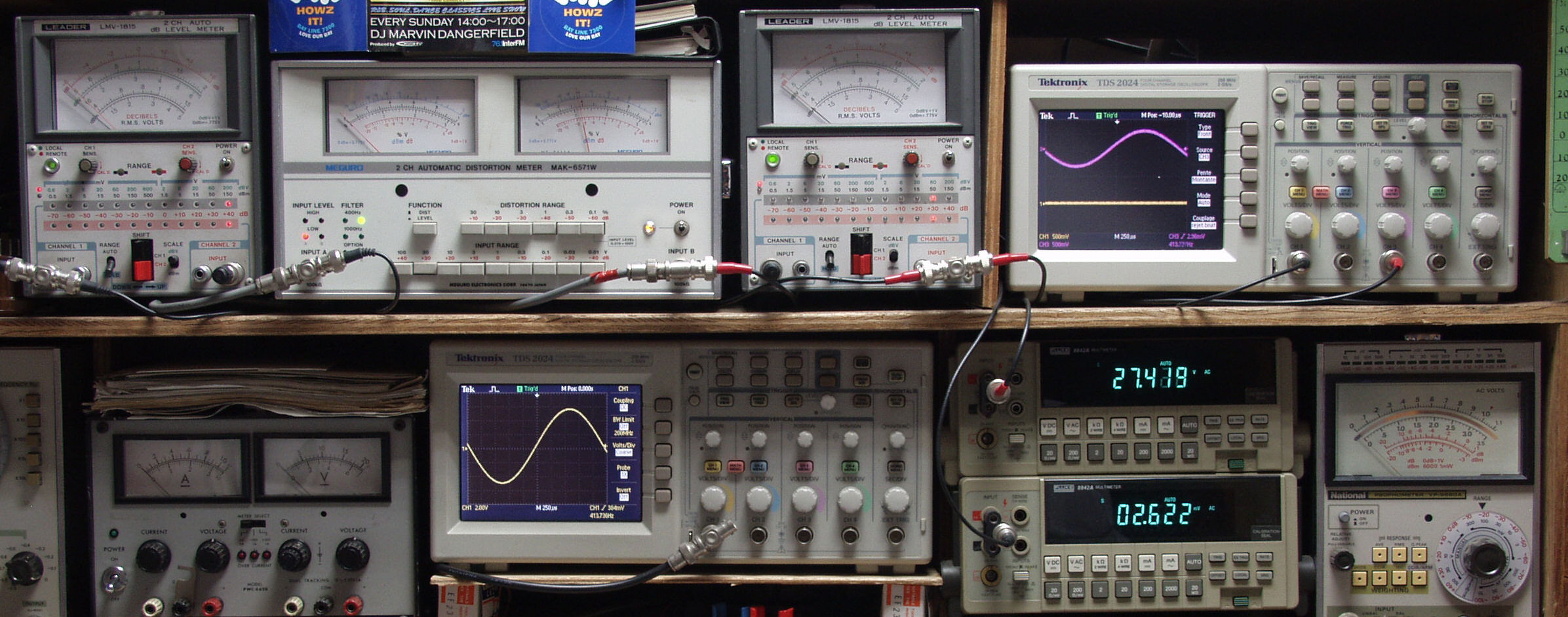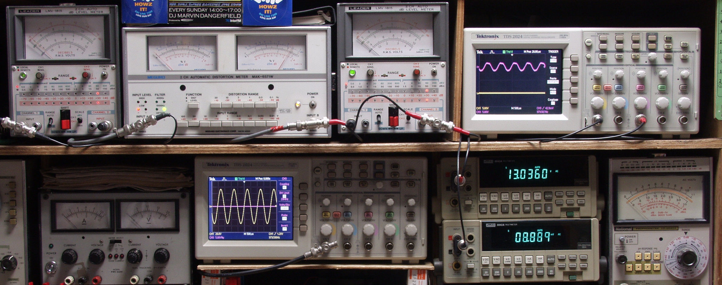 上段中左 歪み率計=出力の歪み率測定 左メータ=L出力、右メータ=R出力
