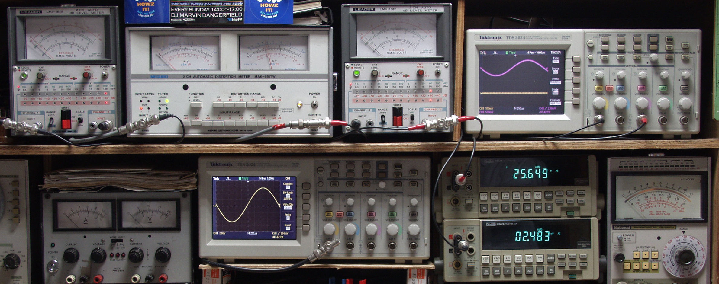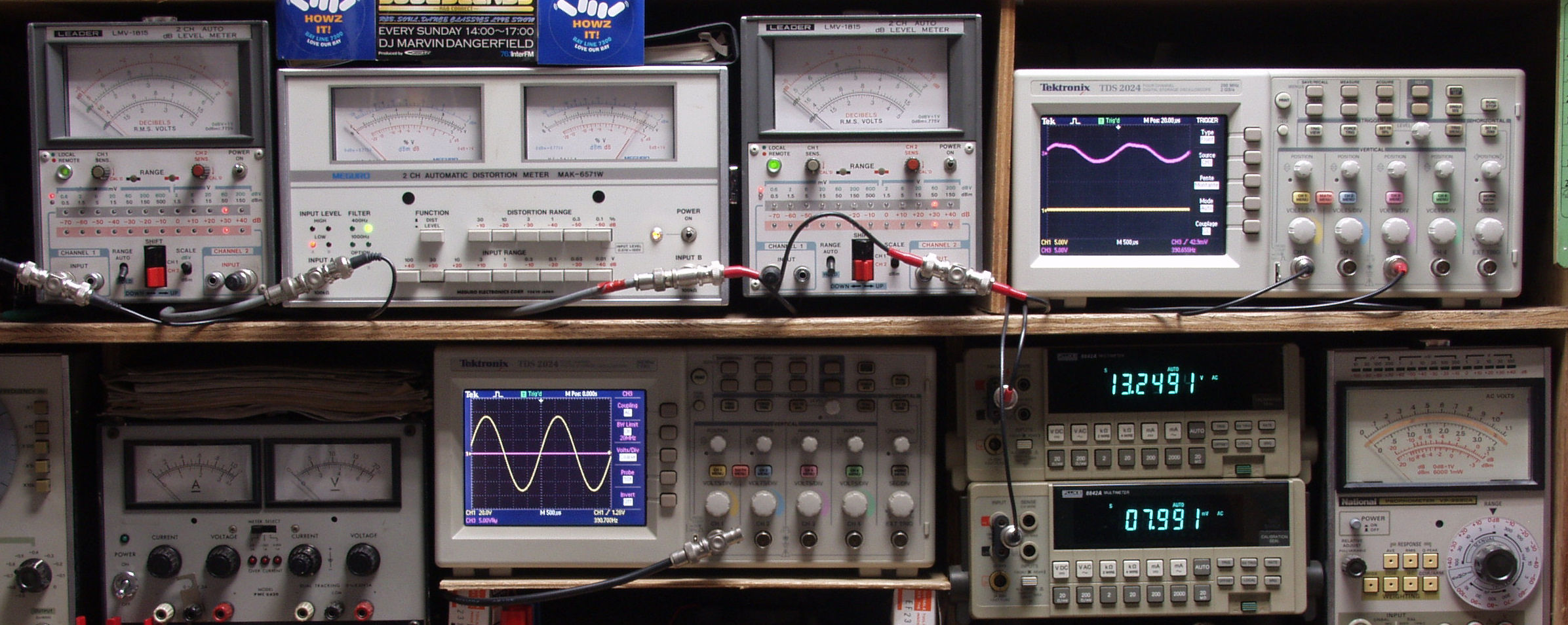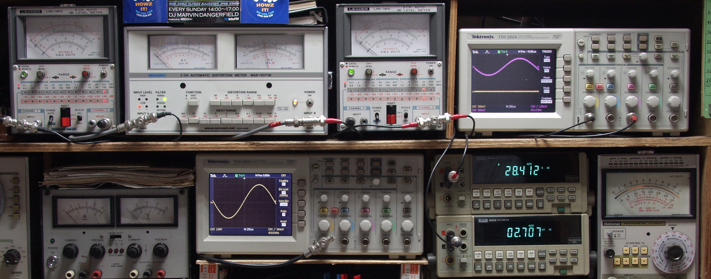 上段中左 歪み率計=出力の歪み率測定 左メータ=L出力、右メータ=R出力