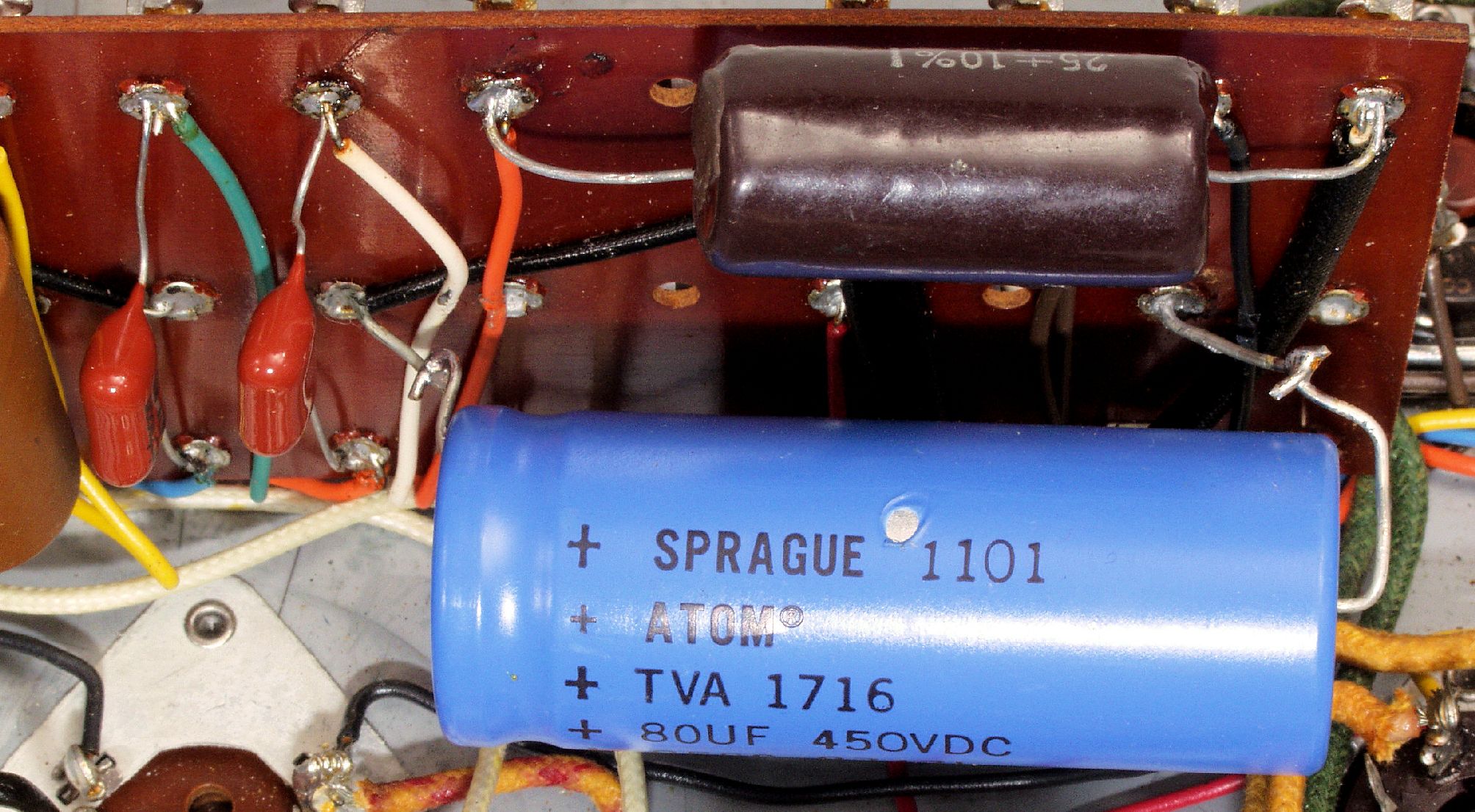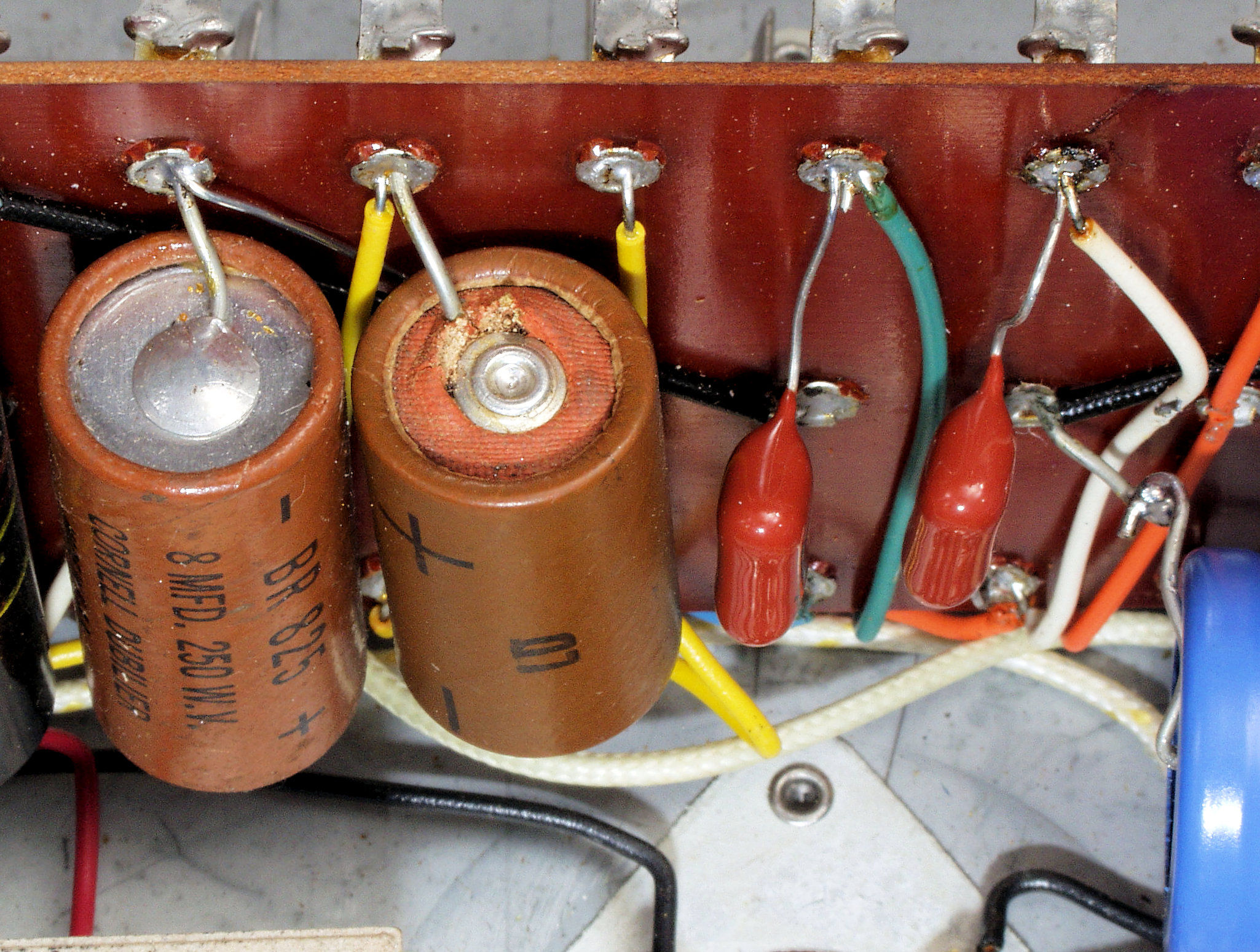 A63. 点検中 交換された電解コンデンサー、リード線を取るのが大変なので、継ぎ足し!