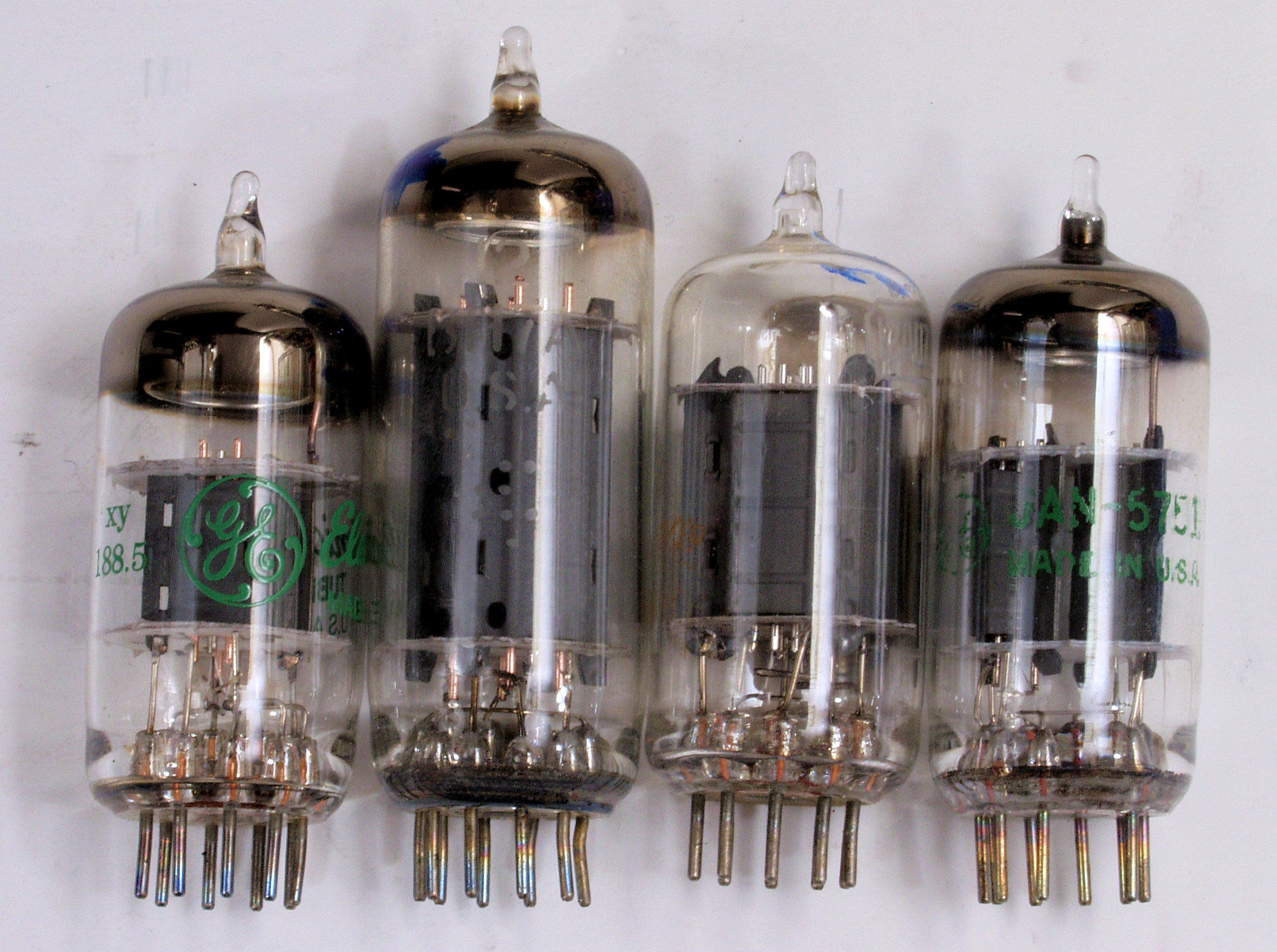 U11.  足の方から見る、左から「12AZ7(12AT7)」、「12BH7」、「12AU7」、「12AX7」。