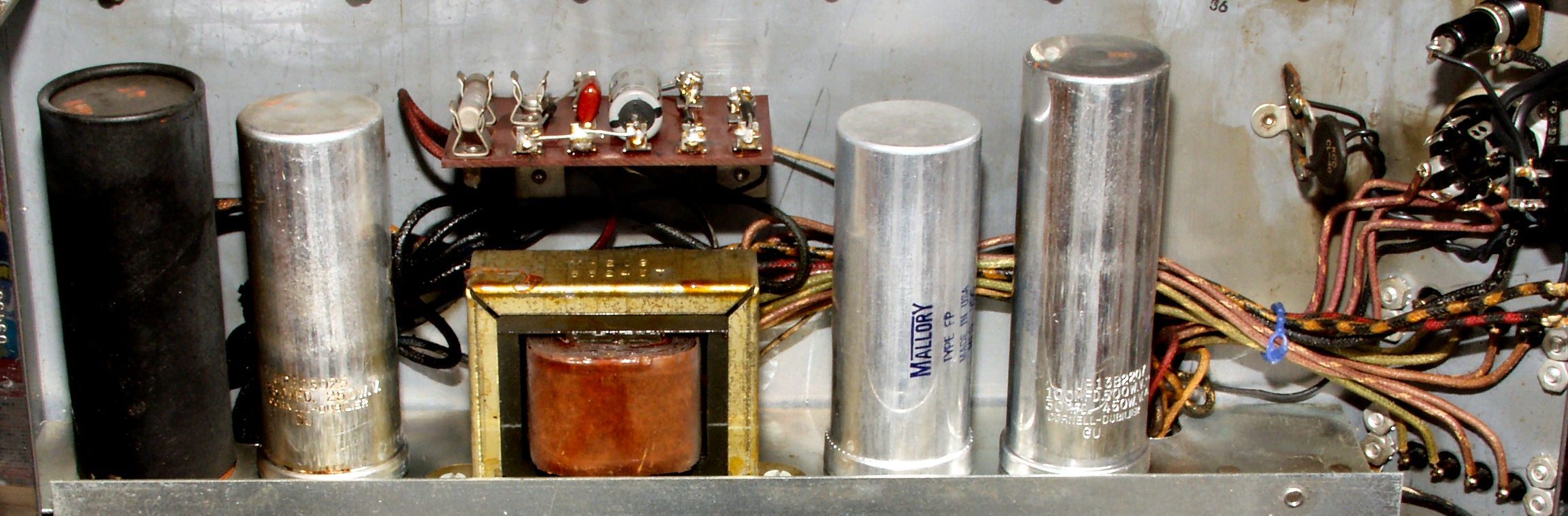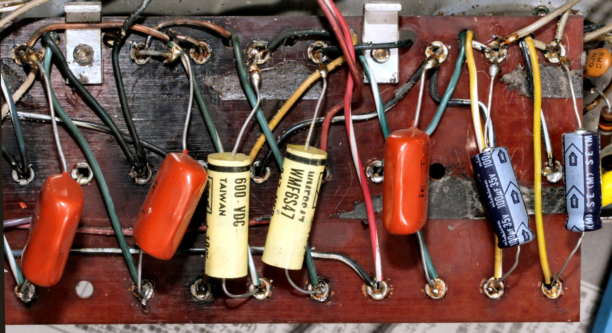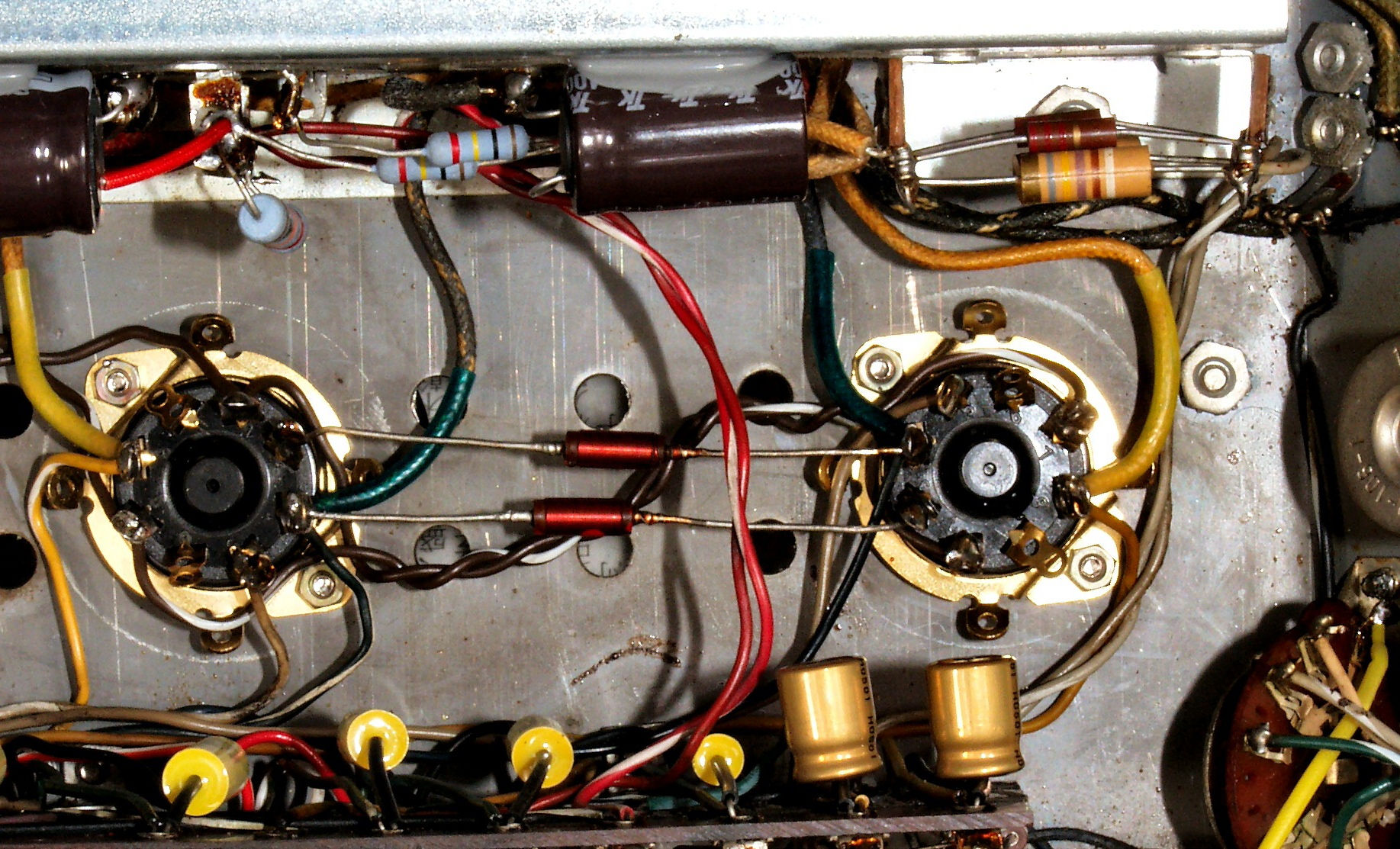 | C32. 修理後 V8−V9(6L6GC)ソケット周り配線、電解コンデンサー2個追加 | ||||||||||||||||||||||||