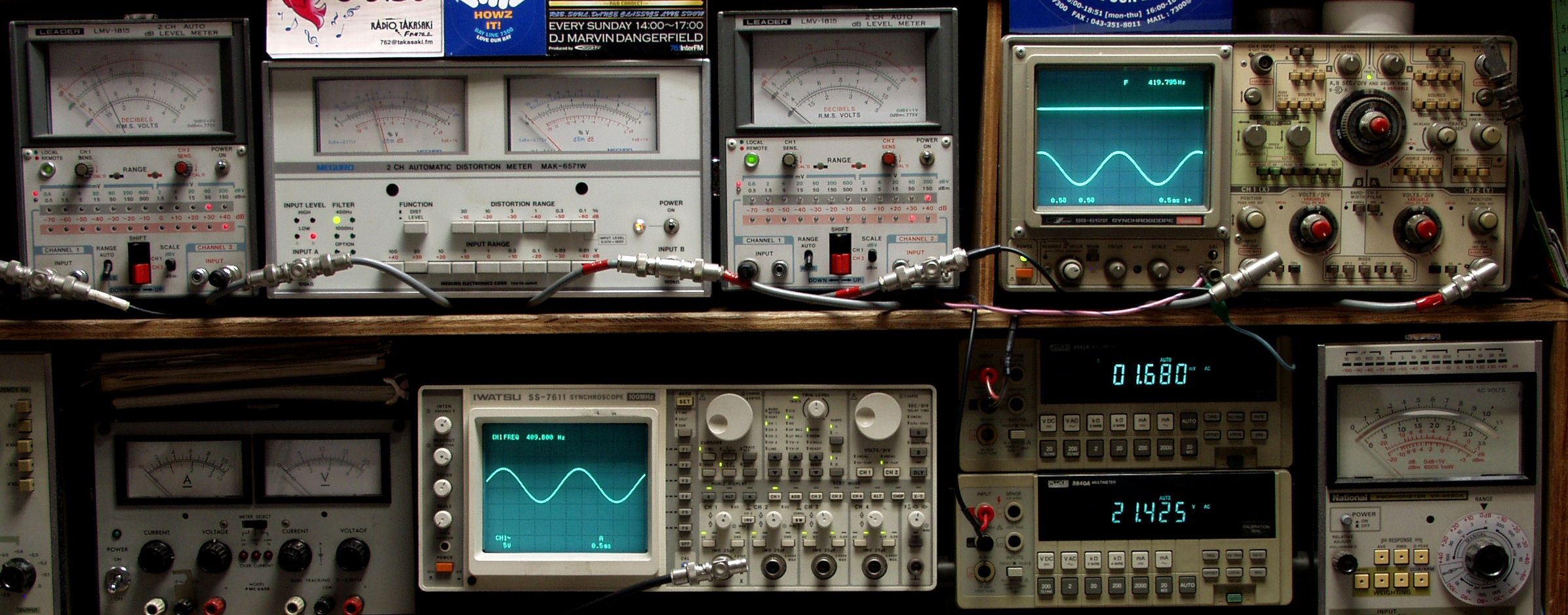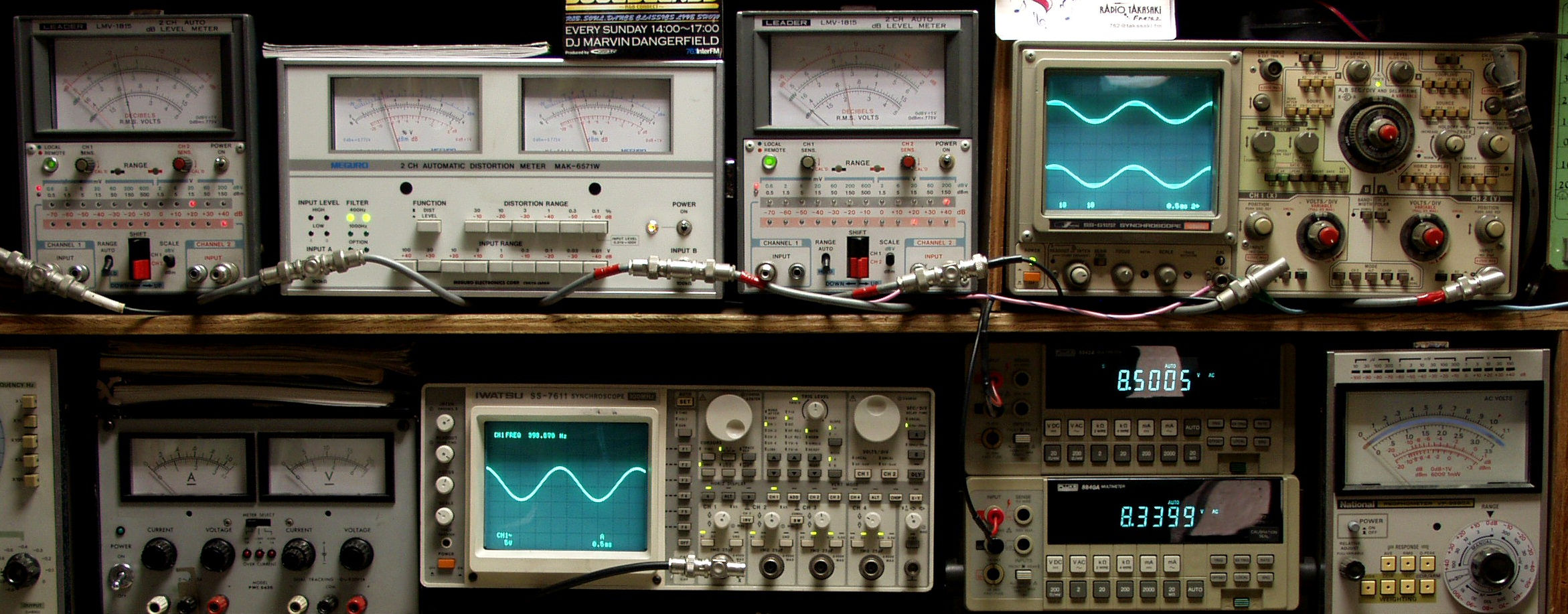 | T. 修理前の測定 T1. 出力・歪み率測定 <見方> 下段左端 オーディオ発振器より400HZ・1KHZの信号を出し(歪み率=約0.003%)これをAMPに入力し、出力を測定 下段中左 オシロ=入力波形(オーディオ発振器のTTLレベル) 下段中右上=周波数計 上段左端 電圧計=L側出力電圧測定、黒針のみ使用 上段中左 歪み率計=出力の歪み率測定 左メータ=L出力、右メータ=R出力 上段中右 電圧計=R側出力電圧測定、赤針のみ使用 上段右端 オシロ=出力波形 上=R出力、下=L出力(実際にはRL電圧計の出力「Max1V」を観測) 下段中右上 デジタル電圧計=R出力電圧測定 下段中右下 デジタル電圧計=L出力電圧測定 |