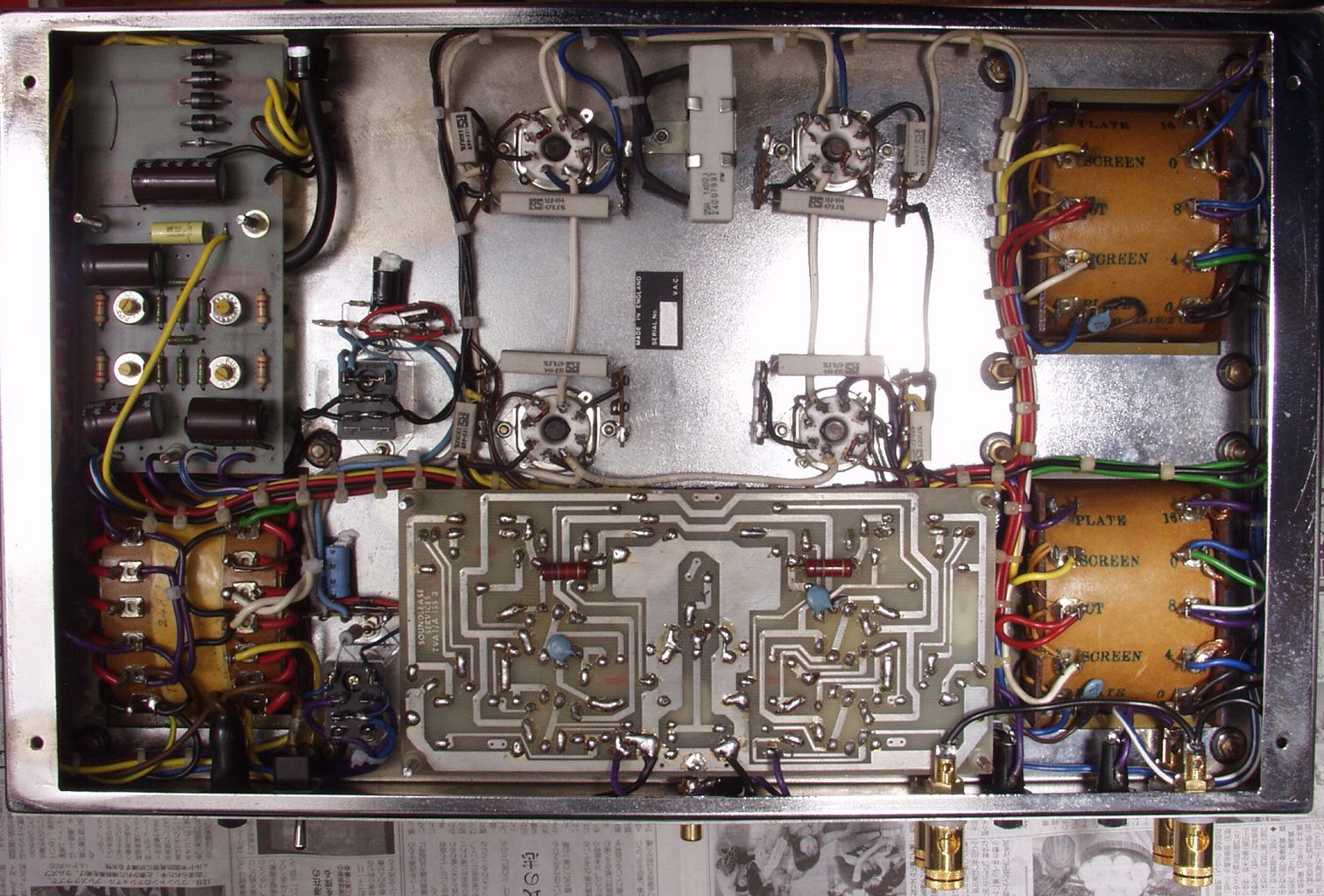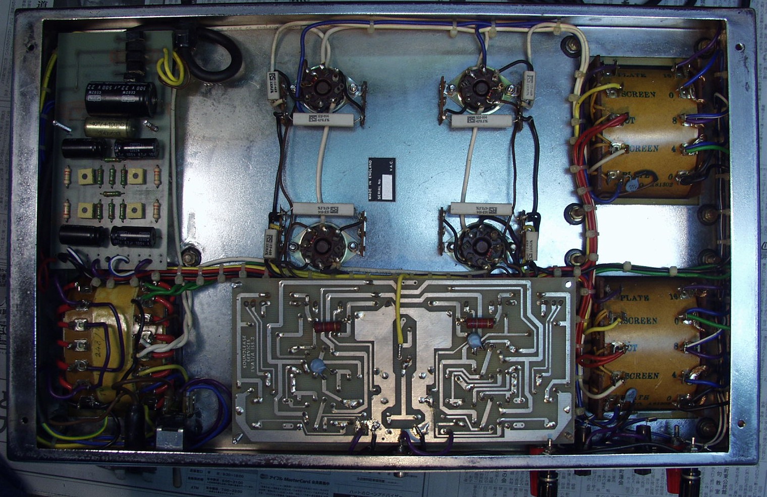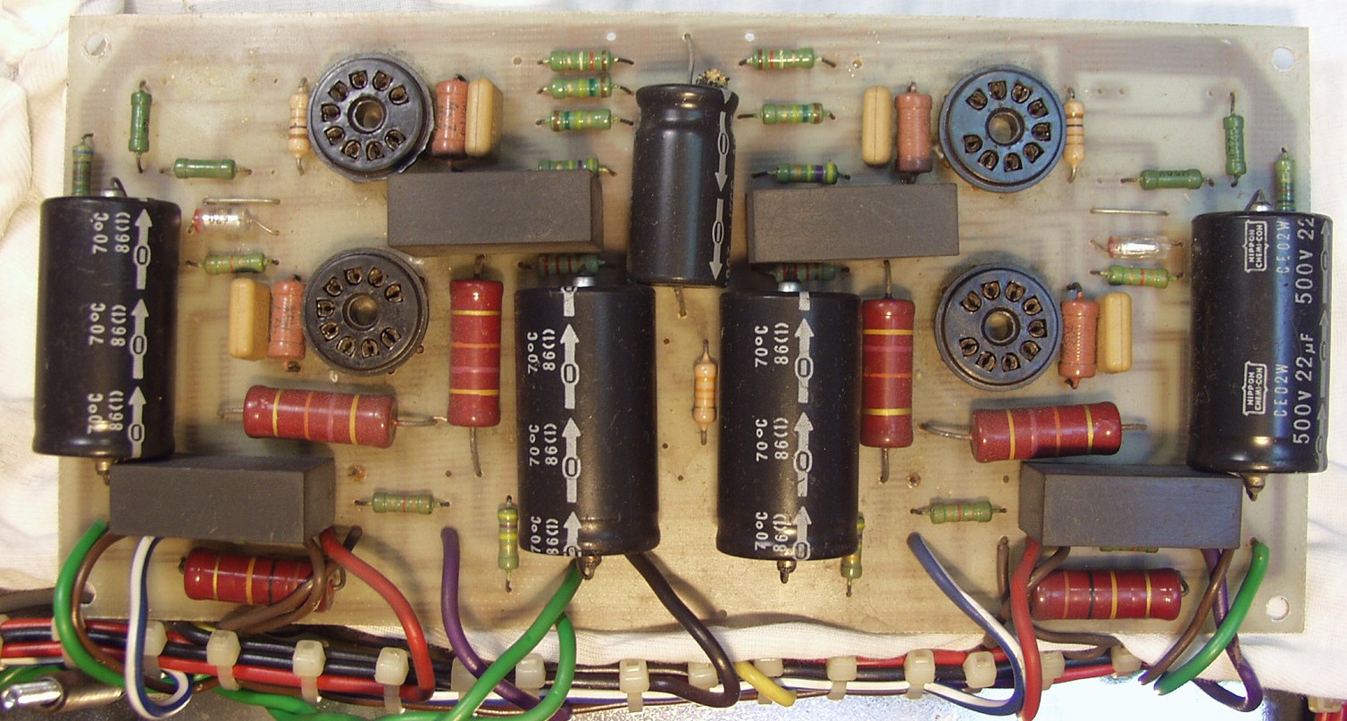 | C1B. 修理後 前段AMP基板 真空管ソケット4個、電解コンデンサー5個、フイルムコンデンサー4個交換 | ||||||||||||||||||||||