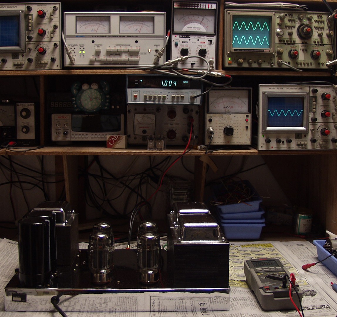 | A5. 修理前の点検、 応急処置で出力・歪み測定 R側=20V=50W 歪み率=1.5% 400HZ L側=16V=32W 歪み率=3% 400HZ |