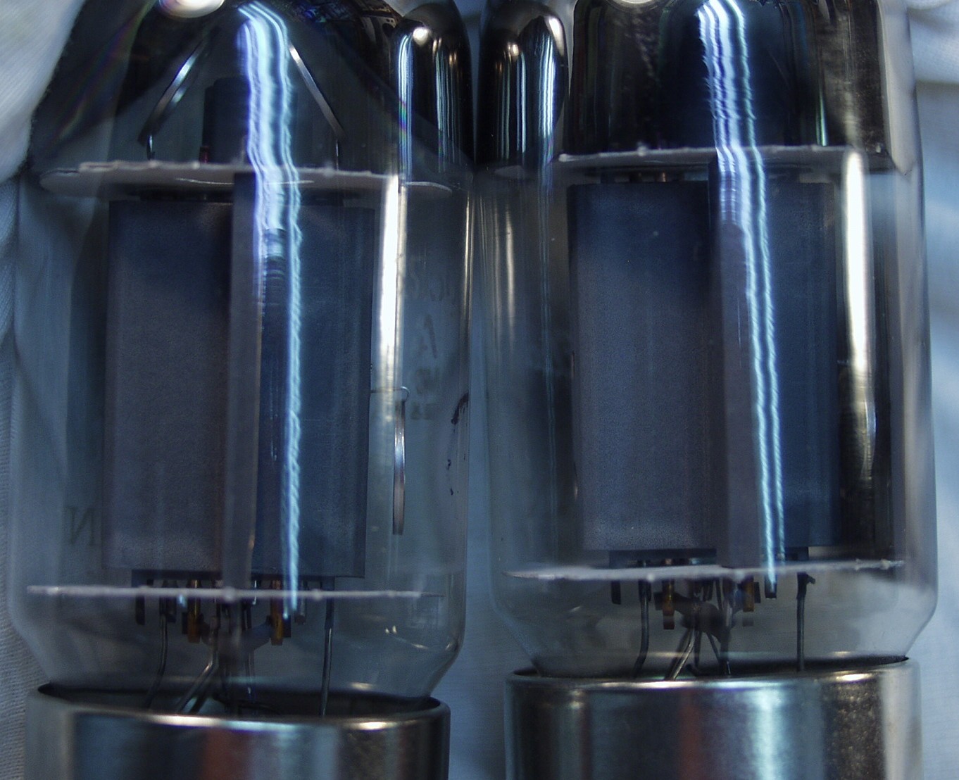 | A6A. 修理前の点検、 使われていた終段6550A R側 プレートの色が異なる。 過大電流で赤熱するとこの様になる | ||||||||||||||||||||||