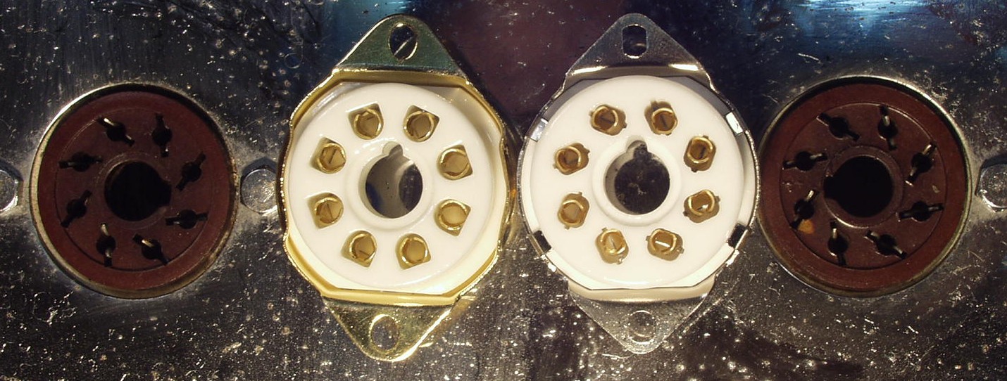 | A4. 修理前の点検、 KT−88のソケット比較 中=交換するステアタイト製、両側=古いモールド製 | ||||||||||||||||||||||