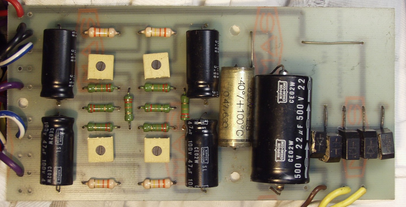 | C2B. 修理後 整流・バイアス基盤 整流ダイオード5個、半固定VR4個、電解コンデンサー5個、フイルムコンデンサー交換 | ||||||||||||||||||||||