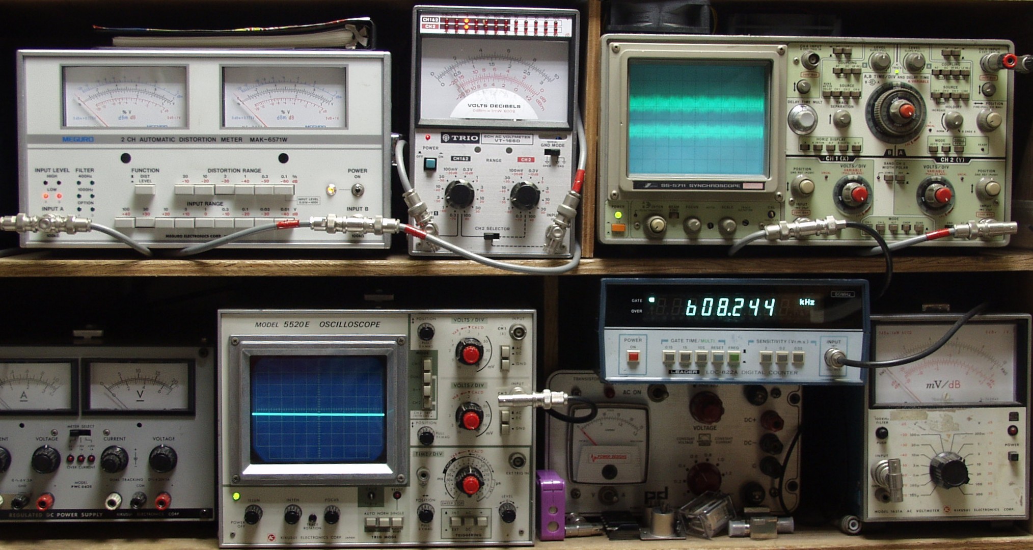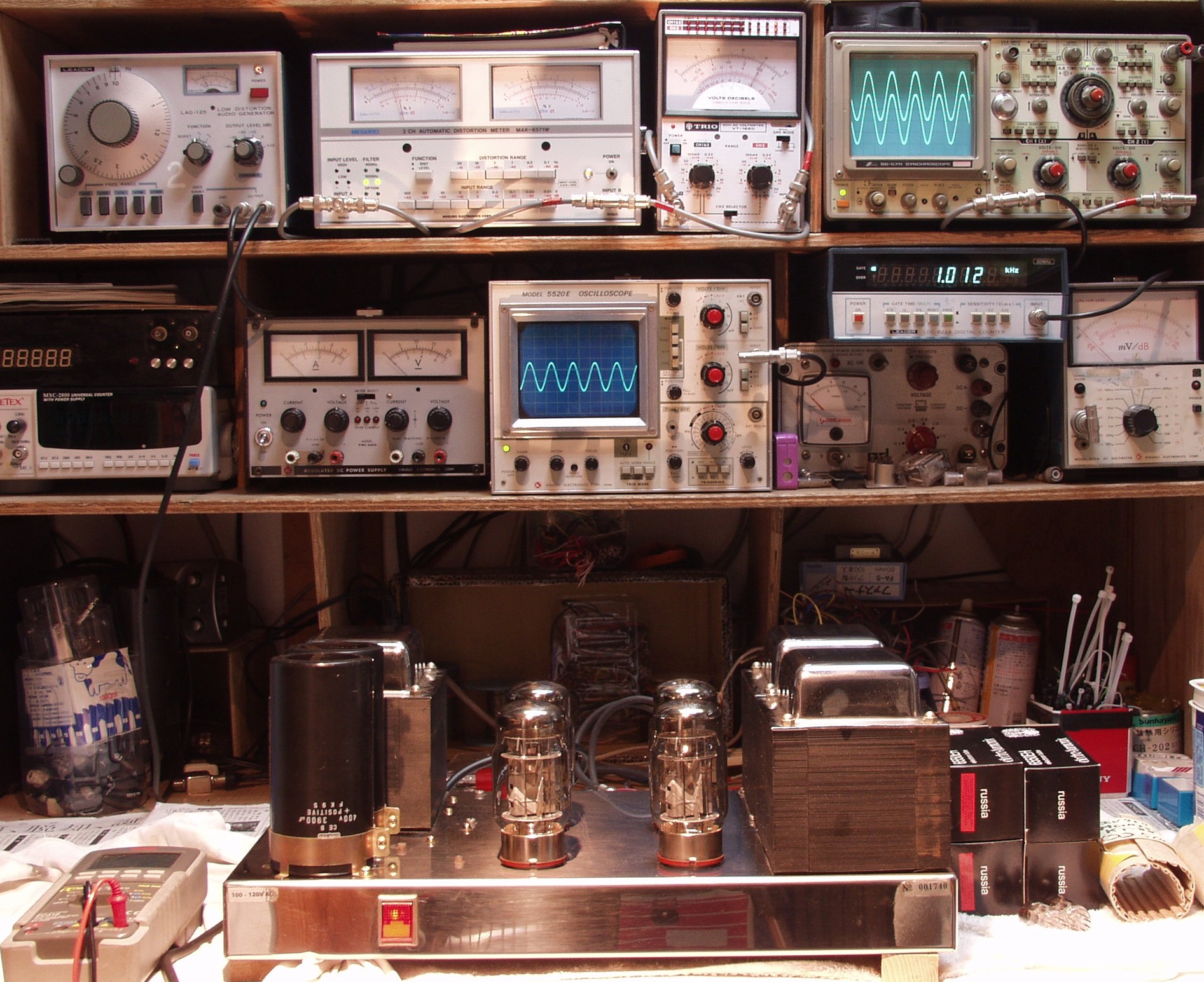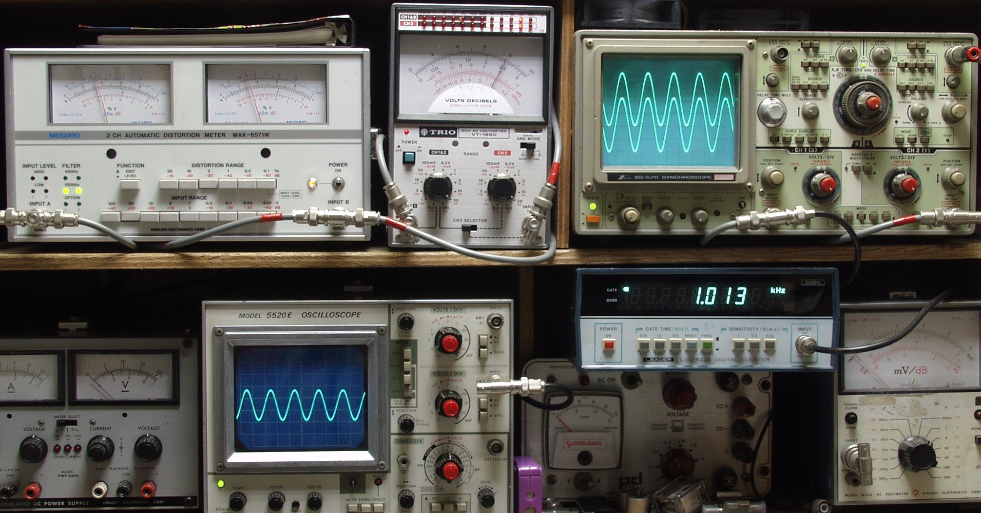 | E. 調整・測定 E1. 調整・出力測定 初段の12AX7がNGなので手持ちので測定。 <見方> 上左オーディオ発振器より400HZ・1KHZの信号を出す(歪み率=約0.003%)。 下中=入力波形(オーディオ発振器のTTLレベル) 下右=周波数計。 上左=SP出力の歪み率測定 左メータ=L出力、右メータ=R出力。 上中=SP出力電圧測定器、赤針=R出力、黒針=L出力。 上右=SP出力波形オシロ 上=R出力、下=L出力(出力電圧測定器の出力) |