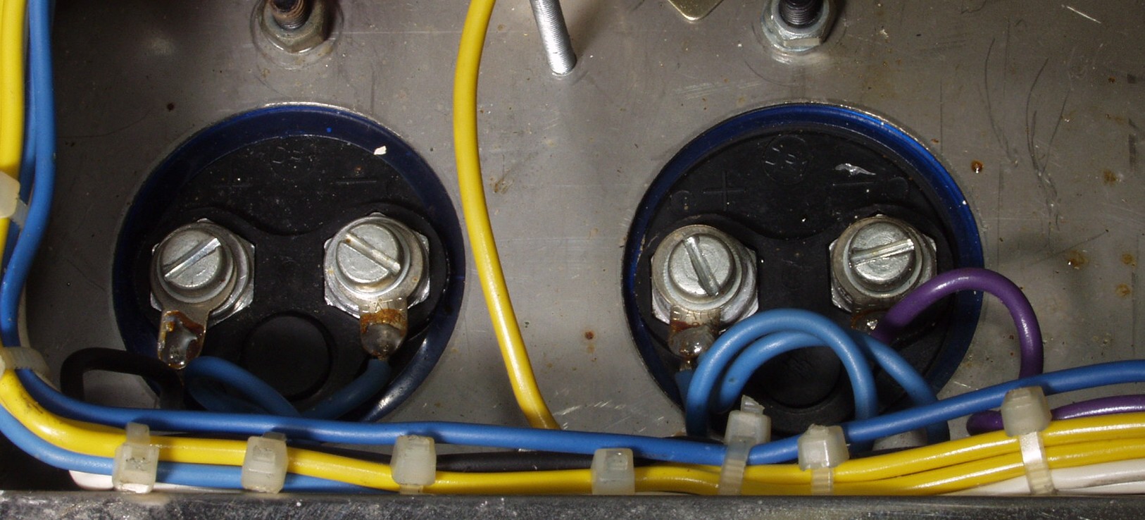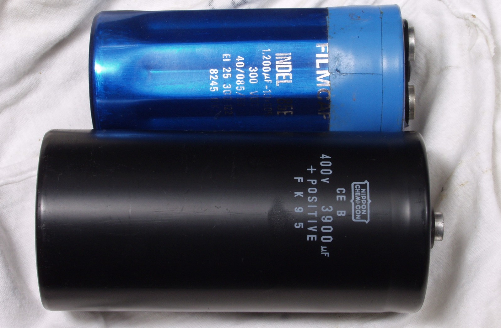 | A62. 修理前点検 高圧コンデンサー比較 下=交換する物 3900μF/400WV、上=付いていた物 1200μF/300WV。 | ||||||||||||||||||||||