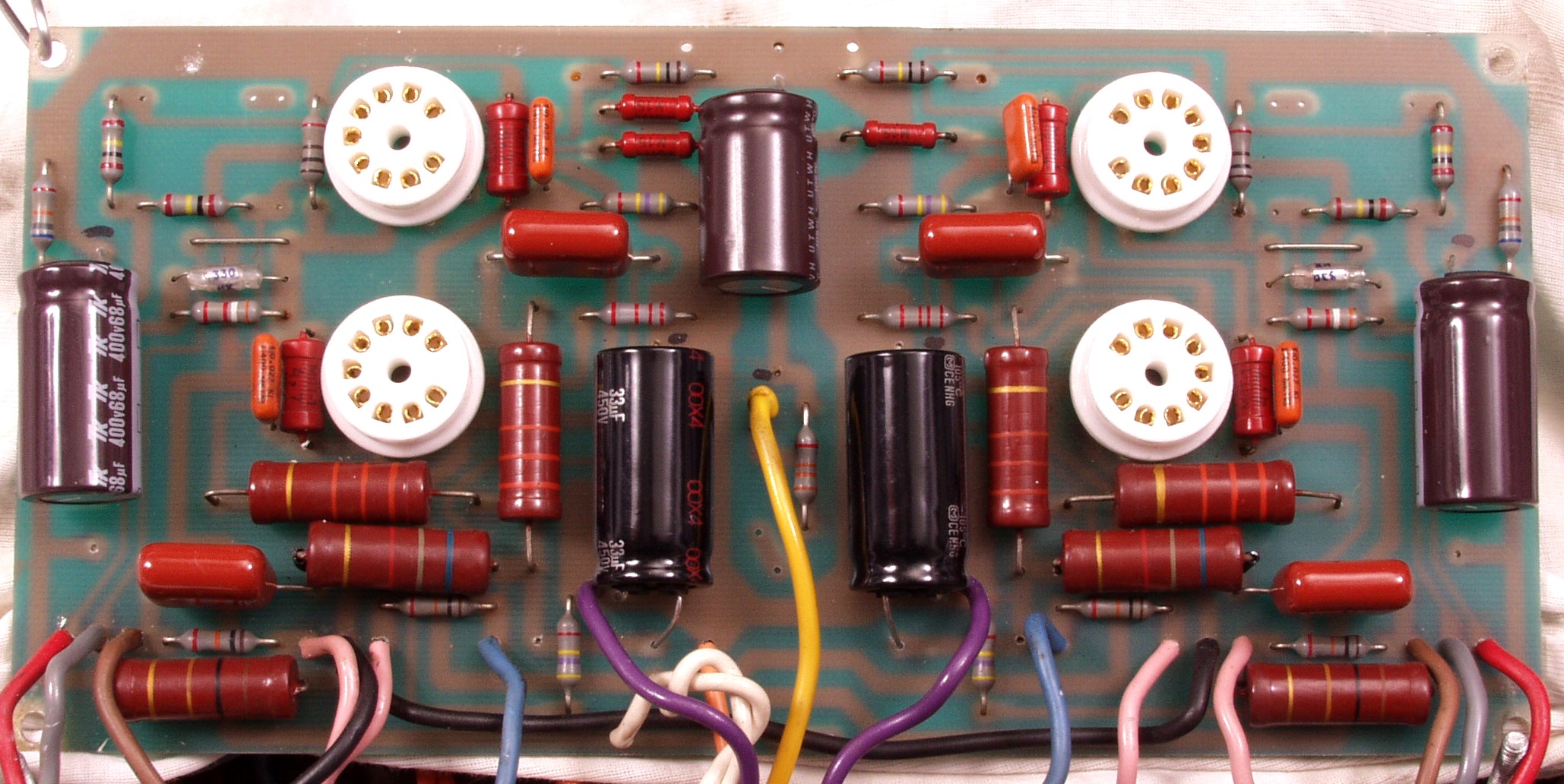 | C12. 修理後 前段AMP基板 真空管ソケット4個、電解コンデンサー5個、フイルムコンデンサー4個交換。 引きだし線は表に移動して銅箔へのストレスを解消する |