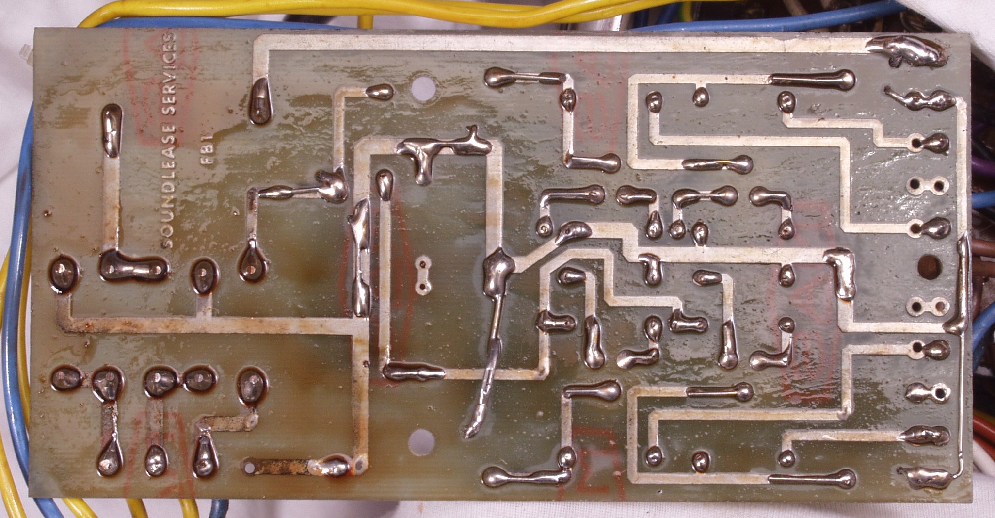 | C13. 修理前 前段AMP基板裏 手抜きで引き出し線がみな銅箔に半田付け これでは銅箔が直ぐに剥離する | ||||||||||||||||||||||