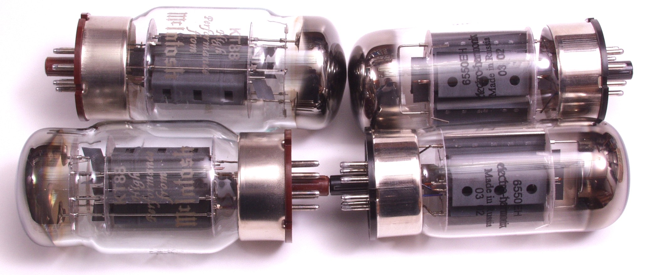 | A8. 修理前点検 左=送られてきた「McIntosh純正KT−88」。 右=手持ちの「electro−harmonixの6550EH」。 「McIntosh純正KT−88」 1本の購入価格で「electro−harmonixの6550EH」が6本買えるが!! |